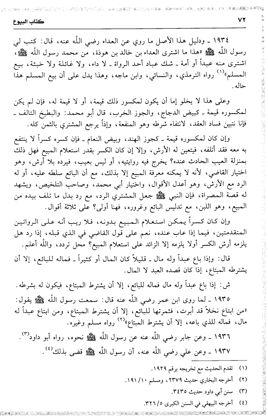 1934 ودليل هذا الأصل ما روي عن العداء رضي اللَّه عنه ، قال : كتب لي رسول اللَّه ( هذا ما اشترى العداء بن خالد بن هوذة ، من محمد رسول اللَّه ، اشترى منه عبداً أو أمة شك عباد أحد الرواة لا داء ، ولا غائلة ولا خبثة ، بيع المسلم ) رواه الترمذي ، والنسائي ، وابن ماجه ، وهذا يدل على أن بيع المسلم هذا حاله .