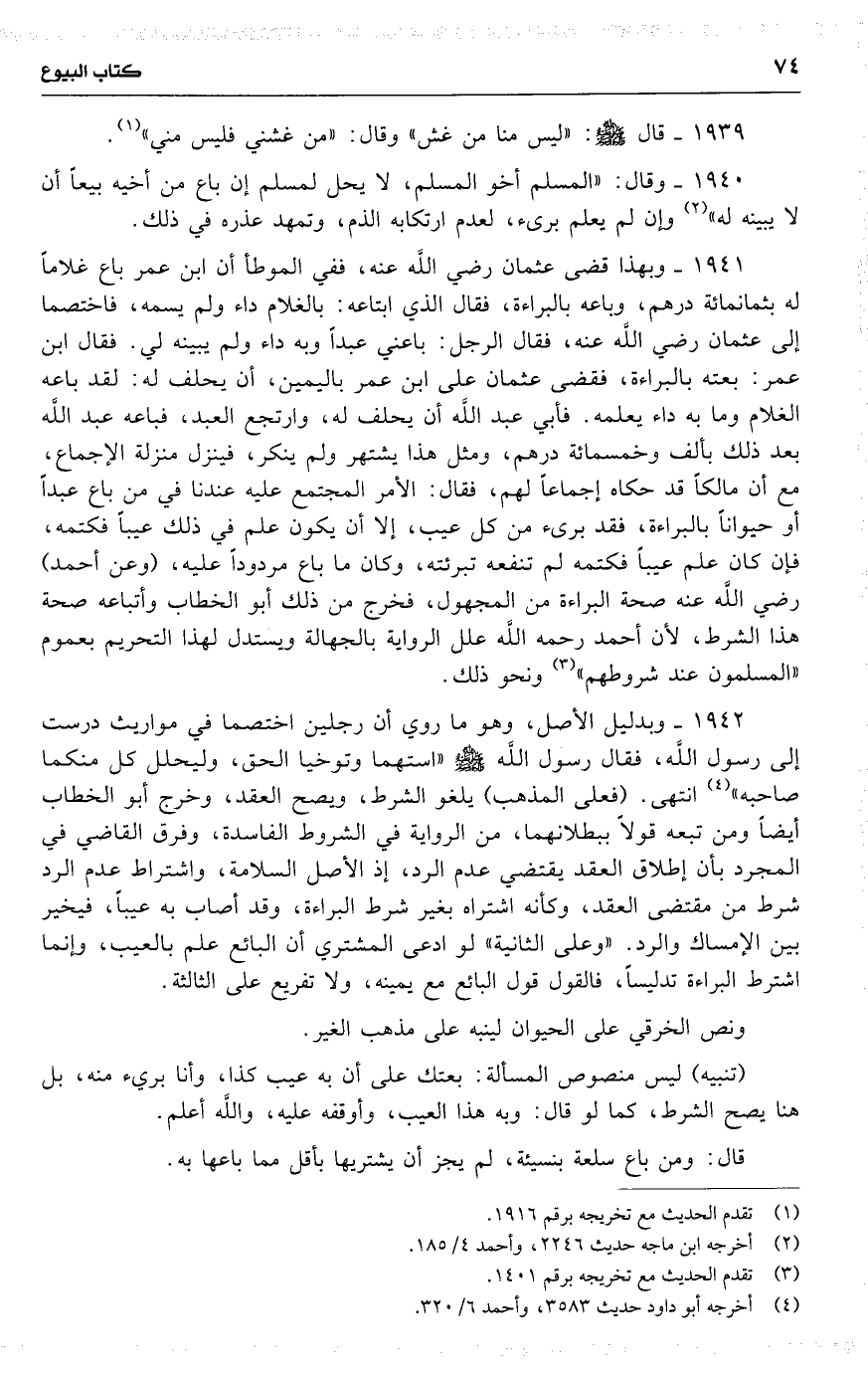 1941 وبهذا قضى عثمان رضي اللَّه عنه ، ففي الموطأ أن ابن عمر باع غلاماً له بثمانمائة درهم ، وباعه بالبراءة ، فقال الذي ابتاعه : بالغلام داء ولم يسمه ، فاختصما إلى عثمان رضي اللَّه عنه ، فقال الرجل : باعني عبداً وبه داء ولم يبينه لي . فقال ابن عمر : بعته بالبراءة ، فقضى عثمان على ابن عمر باليمين ، أن يحلف له : لقد باعه الغلام وما به داء يعلمه . فأبي عبد اللَّه أن يحلف له ، وارتجع العبد ، فباعه عبد اللَّه بعد ذلك بألف وخمسمائة درهم ، ومثل هذا يشتهر ولم ينكر ، فينزل منزلة الإجماع ، مع أن مالكاً قد حكاه إجماعاً لهم ، فقال : الأمر المجتمع عليه عندنا في من باع عبداً أو حيواناً بالبراءة ، فقد برىء من كل عيب ، إلا أن يكون علم في ذلك عيباً فكتمه ، فإن كان علم عيباً فكتمه لم تنفعه تبرئته ، وكان ما باع مردوداً عليه ، ( وعن أحمد ) رضي اللَّه عنه صحة البراءة من المجهول ، فخرج من ذلك أبو الخطاب وأتباعه صحة هذا الشرط ، لأن أحمد رحمه اللَّه علل الرواية بالجهالة ويستدل لهذا التحريم بعموم ( المسلمون عند شروطهم ) ونحو ذلك .