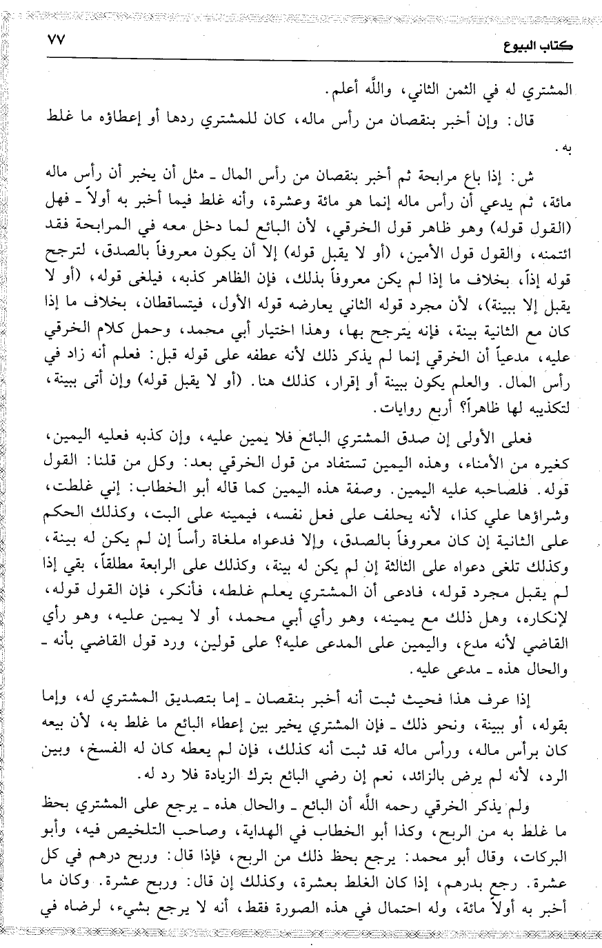 ش : إذا باع مرابحة ثم أخبر بنقصان من رأس المال مثل أن يخبر أن رأس ماله مائة ، ثم يدعي أن رأس ماله إنما هو مائة وعشرة ، وأنه غلط فيما أخبر به أولاً فهل ( القول قوله ) وهو ظاهر قول الخرقي ، لأن البائع لما دخل معه في المرابحة فقد ائتمنه ، والقول قول الأمين ، ( أو لا يقبل قوله ) إلا أن يكون معروفاً بالصدق ، لترجح قوله إذاً ، بخلاف ما إذا لم يكن معروفاً بذلك ، فإن الظاهر كذبه ، فيلغى قوله ، ( أو لا يقبل إلا ببينة ) ، لأن مجرد قوله الثاني يعارضه قوله الأول ، فيتساقطان ، بخلاف ما إذا كان مع الثانية بينة ، فإنه يترجح بها ، وهذا اختيار أبي محمد ، وحمل كلام الخرقي عليه ، مدعياً أن الخرقي إنما لم يذكر ذلك لأنه عطفه على قوله قبل : فعلم أنه زاد في رأس المال . والعلم يكون ببينة أو إقرار ، كذلك هنا . ( أو لا يقبل قوله ) وإن أتى ببينة ، لتكذيبه لها ظاهراً ؟ أربع روايات .