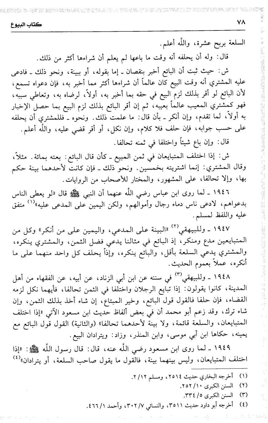 1947 وللبيهقي ( البينة على المدعي ، واليمين على من أنكر ) وكل من المتبايعين مدع ومنكر ، إذ البائع في مثالنا يدعي فضل الثمن ، والمشتري ينكره ، والمشتري يدعي السلعة بأقل ، والبائع ينكره ، وإذاً يحلف كل واحد منهما على ما أنكره ، عملاً بعموم الحديث .