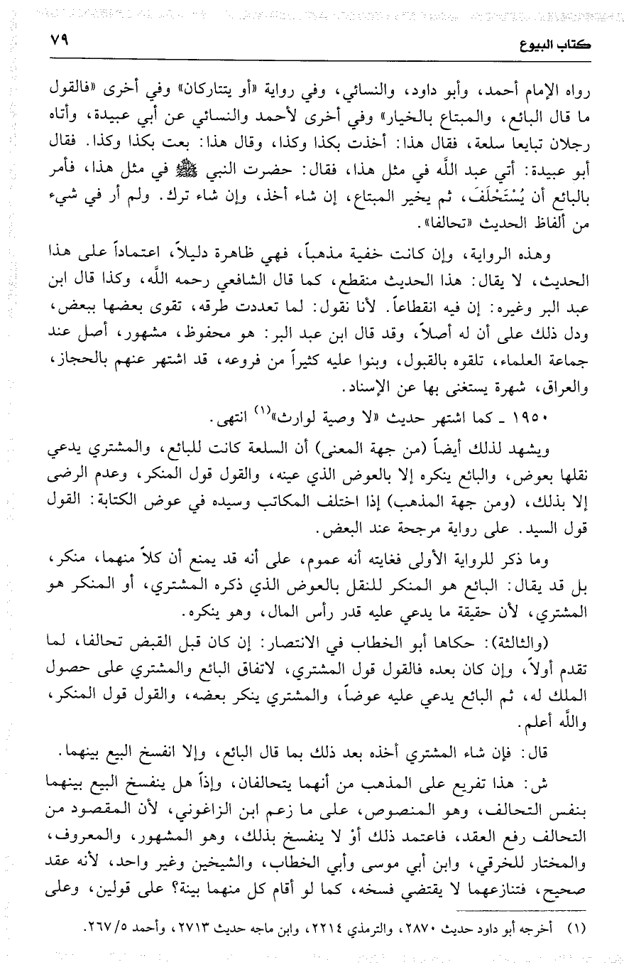 رواه الإمام أحمد ، وأبو داود ، والنسائي ، وفي رواية ( أو يتتاركان ) وفي أخرى ( فالقول ما قال البائع ، والمبتاع بالخيار ) وفي أخرى لأحمد والنسائي عن أبي عبيدة ، وأتاه رجلان تبايعا سلعة ، فقال هذا : أخذت بكذا وكذا ، وقال هذا : بعت بكذا وكذا . فقال أبو عبيدة : أتي عبد اللَّه في مثل هذا ، فقال : حضرت النبي في مثل هذا ، فأمر بالبائع أن يُسْتَحْلَفَ ، ثم يخير المبتاع ، إن شاء أخذ ، وإن شاء ترك . ولم أر في شيء من ألفاظ الحديث ( تحالفاً ) .