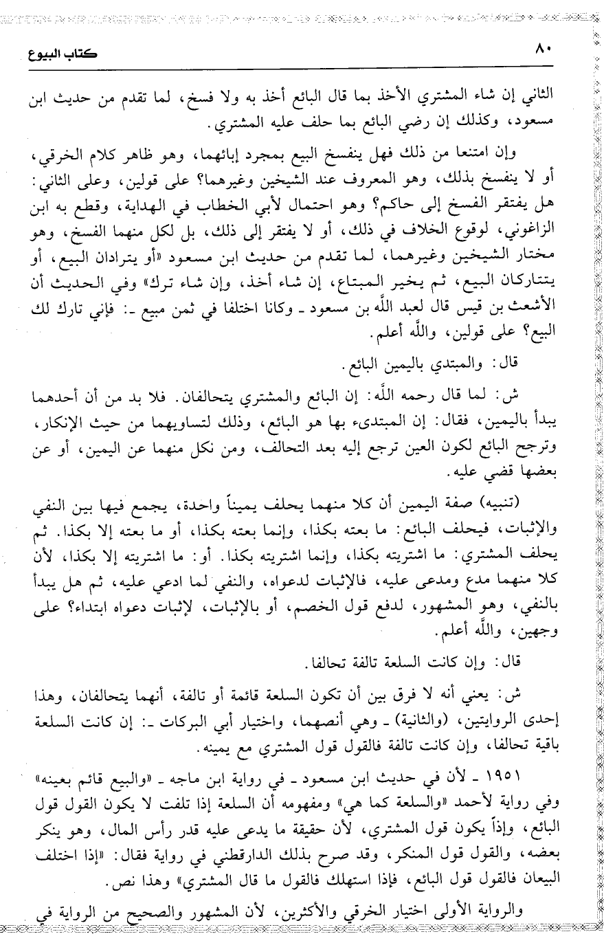 1951 لأن في حديث ابن مسعود في رواية ابن ماجه ( والبيع قائم بعينه ) وفي رواية لأحمد ( والسلعة كما هي ) ومفهومه أن السلعة إذا تلفت لا يكون القول قول البائع ، وإذاً يكون قول المشتري ، لأن حقيقة ما يدعى عليه قدر رأس المال ، وهو ينكر بعضه ، والقول قول المنكر ، وقد صرح بذلك الدارقطني في رواية فقال ( إذا اختلف البيعان فالقول قول البائع ، فإذا استهلك فالقول ما قال المشتري ) وهذا نص .