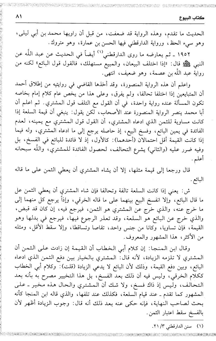 1952 ثم يعارضه ما روى الدارقطني أيضاً في الحديث عن عبد اللَّه عن النبي قال : ( إذا اختلف البيعان ، والمبيع مستهلك ، فالقول قول البائع ) لكنه من رواية عبد اللَّه بن عصمة ، وهو ضعيف ، انتهى .