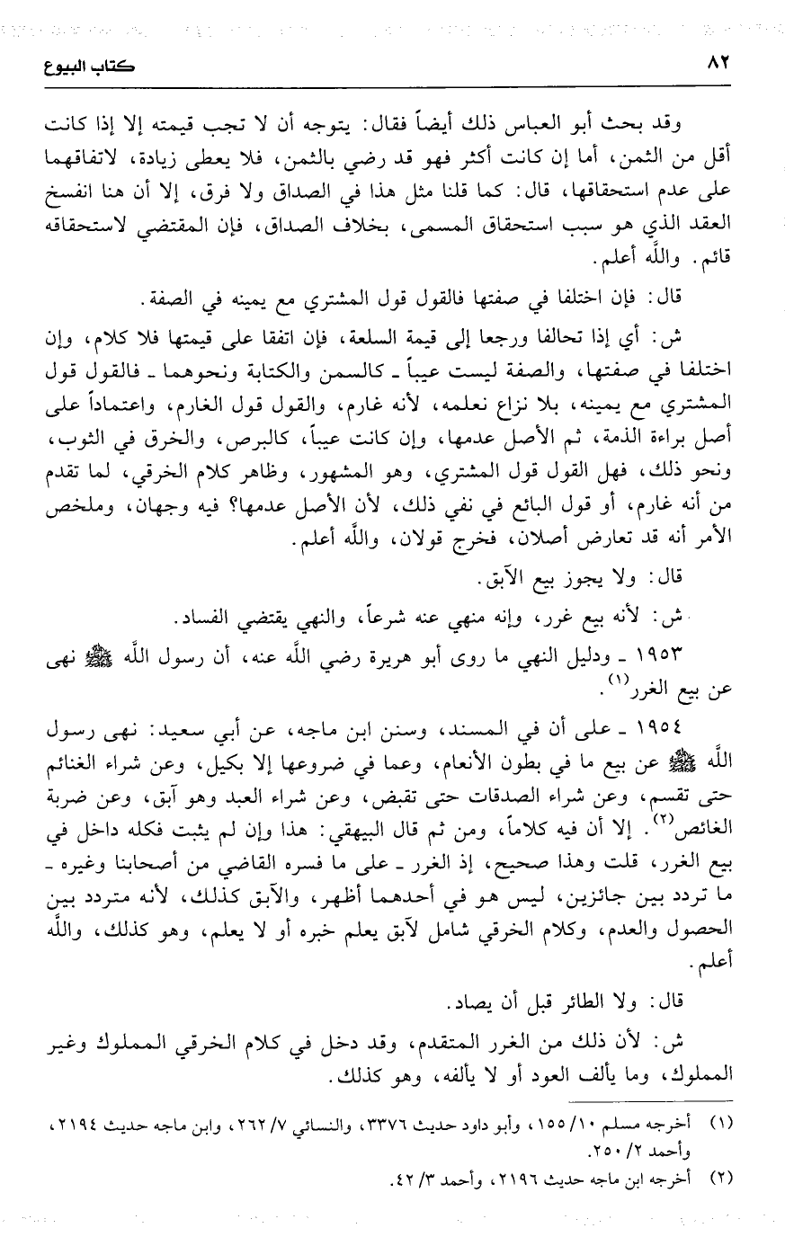 1954 على أن في المسند ، وسنن ابن ماجه ، عن أبي سعيد : نهى رسول اللَّه عن بيع ما في بطون الأنعام ، وعما في ضروعها إلا بكيل ، وعن شراء الغنائم حتى تقسم ، وعن شراء الصدقات حتى تقبض ، وعن شراء العبد وهو آبق ، وعن ضربة الغائص . إلا أن فيه كلاماً ، ومن ثم قال البيهقي : هذا وإن لم يثبت فكله داخل في بيع الغرر ، [ قلت وهذا صحيح ، إذ الغرر ] على ما فسره القاضي من أصحابنا [ وغيره ] ما تردد بين جائزين ، ليس هو في أحدهما أظهر ، والآبق كذلك ، لأنه متردد بين الحصول والعدم ، وكلام الخرقي شامل لآبق يعلم خبره أو لا يعلم ، وهو كذلك ، واللَّه أعلم .