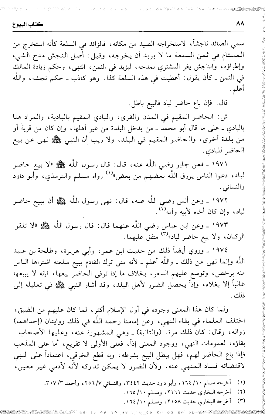 1971 فعن جابر رضي اللَّه عنه ، قال : قال رسول اللَّه ( لا بيع حاضر لباد ، دعوا الناس يرزق اللَّه بعضهم من بعض ) رواه مسلم والترمذي ، وأبو داود والنسائي .