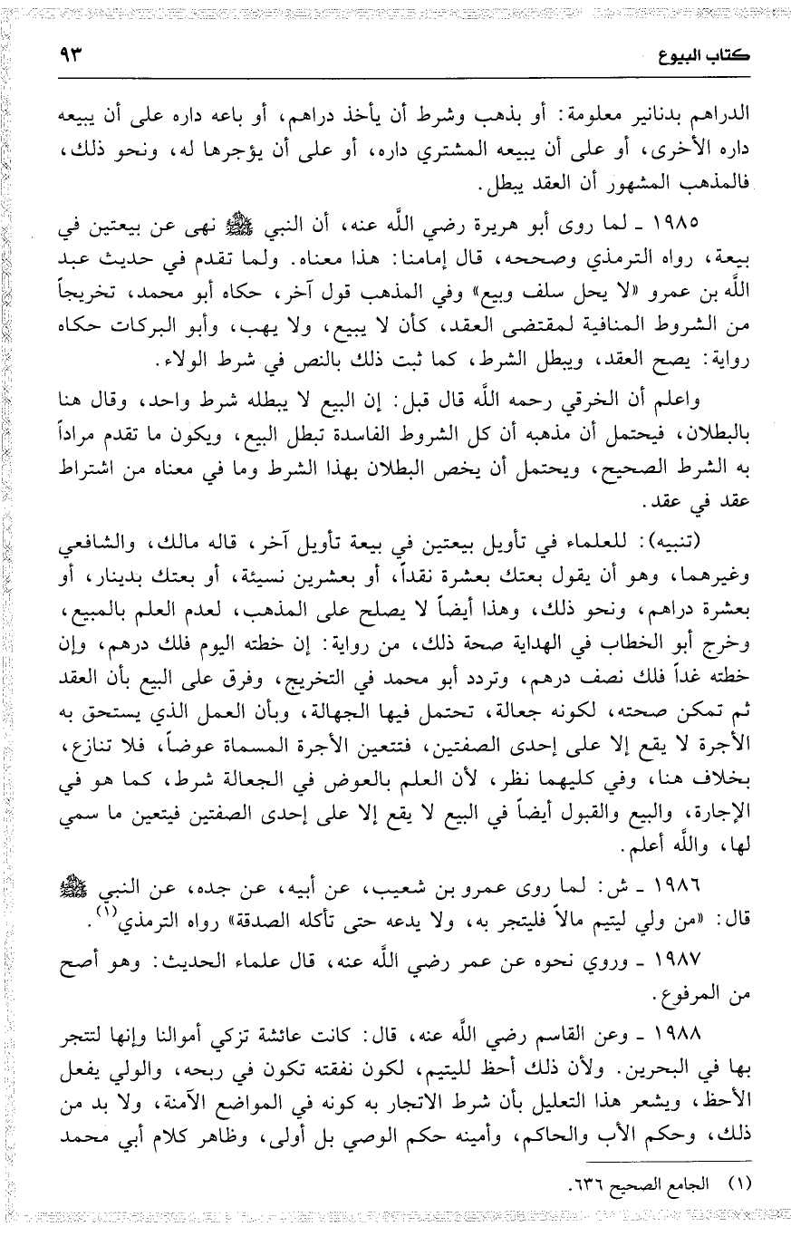 1985 لما روي أبو هريرة رضي اللَّه عنه ، أن النبي نهى عن بيعتين في بيعة ، رواه الترمذي وصححه ، قال إمامنا : هذا معناه . ولما تقدم في حديث عبد اللَّه بن عمرو ( لا يحل سلف وبيع ) وفي المذهب قول آخر ، حكاه أبو محمد ، تخريجاً من الشروط المنافية لمقتضى العقد ، كأن لا يبيع ، ولا يهب ، وأبو البركات حكاه رواية : يصح العقد ، ويبطل الشرط ، كما ثبت ذلك بالنص في شرط الولاء .