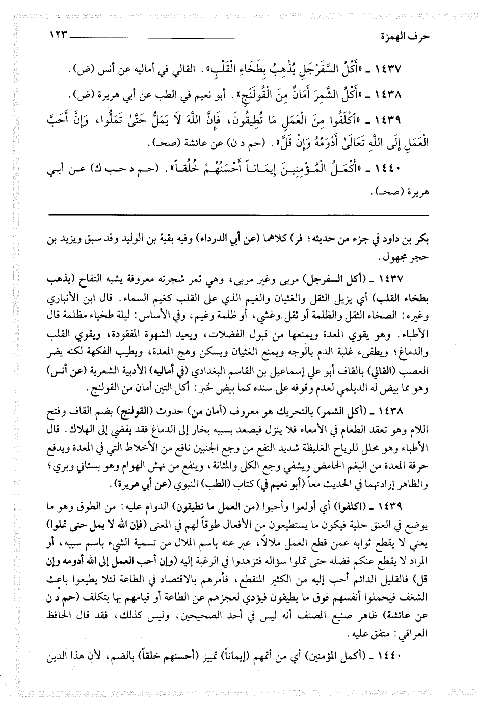 1437 - (أكل السفرجل) مربى وغير مربى ، وهي ثمر شجرته معروفة يشبه التفاح (يذهب بطخاء القلب) أي يزيل الثقل والغثيان والغيم الذي على القلب كغيم السماء.