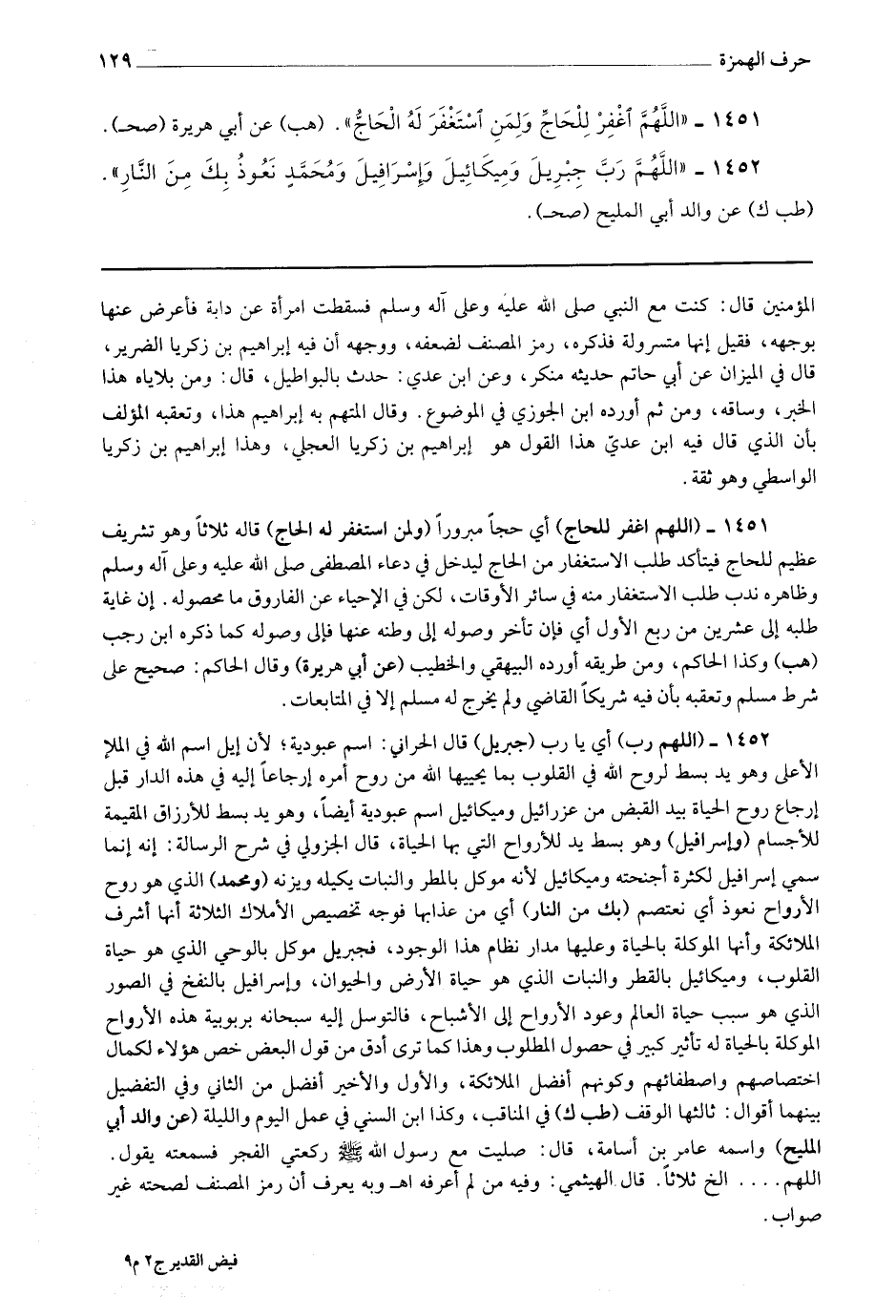 1452 - (اللهم رب) أي يا رب (جبريل) قال الحراني : اسم عبودية ، لأن إيل اسم الله في الملأ الأعلى وهو يد بسط لروح الله في القلوب بما يحييها الله من روح أمره إرجاعا إليه في هذه الدار قبل إرجاع روح الحياة بيد القبض من عزرائيل (وميكائيل) اسم عبودية أيضا ، وهو يد بسط للأرزاق المقيمة للأجسام (وإسرافيل) وهو بسط يد للأرواح التي بها الحياة ، قال الجزولي في شرح الرسالة : إنه إنما سمي إسرافيل لكثرة أجنحته وميكائيل لأنه موكل بالمطر والنبات يكيله ويزنه (ومحمد) الذي هو روح الأرواح (نعوذ) أي نعتصم (بك من النار) أي من عذابها فوجه تخصيص الأملاك الثلاثة أنها أشرف الملائكة وأنها الموكلة بالحياة وعليها مدار نظام هذا الوجود ، فجبريل موكل بالوحي الذي هو حياة القلوب ، وميكائيل بالقطر والنبات الذي هو حياة الأرض والحيوان ، وإسرافيل بالنفخ في الصور الذي هو سبب حياة العالم وعود الأرواح إلى الأشباح ، فالتوسل إليه سبحانه بربوبية هذه الأرواح الموكلة بالحياة له تأثير كبير في حصول المطلوب وهذا كما ترى أدق من قول البعض خص هؤلاء لكمال اختصاصهم واصطفائهم وكونهم أفضل الملائكة ، والأول والأخير أفضل من الثاني وفي التفضيل بينهما أقوال : ثالثها الوقف (طب ك) في المناقب ، وكذا ابن السني في عمل اليوم والليلة (عن والد أبي المليح) واسمه عامر بن أسامة ، قال : صليت مع رسول الله صلى الله عليه وسلم ركعتي الفجر فسمعته يقول.