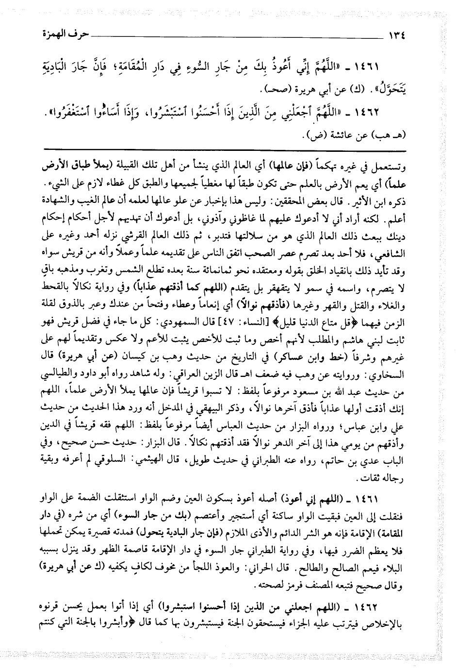 1461 - (اللهم إني أعوذ) أصله أعوذ بسكون العين وضم الواو استثقلت الضمة على الواو فنقلت إلى العين فبقيت الواو ساكنة أي أستجير وأعتصم (بك من جار السوء) أي من شره (في دار المقامة) الإقامة فإنه هو الشر الدائم والأذى الملازم (فإن جار البادية يتحول) فمدته قصيرة يمكن تحملها فلا يعظم الضرر فيها ، وفي رواية الطبراني جار السوء في دار الإقامة قاصمة الظهر وقد ينزل بسببه البلاء فيعم الصالح والطالح.