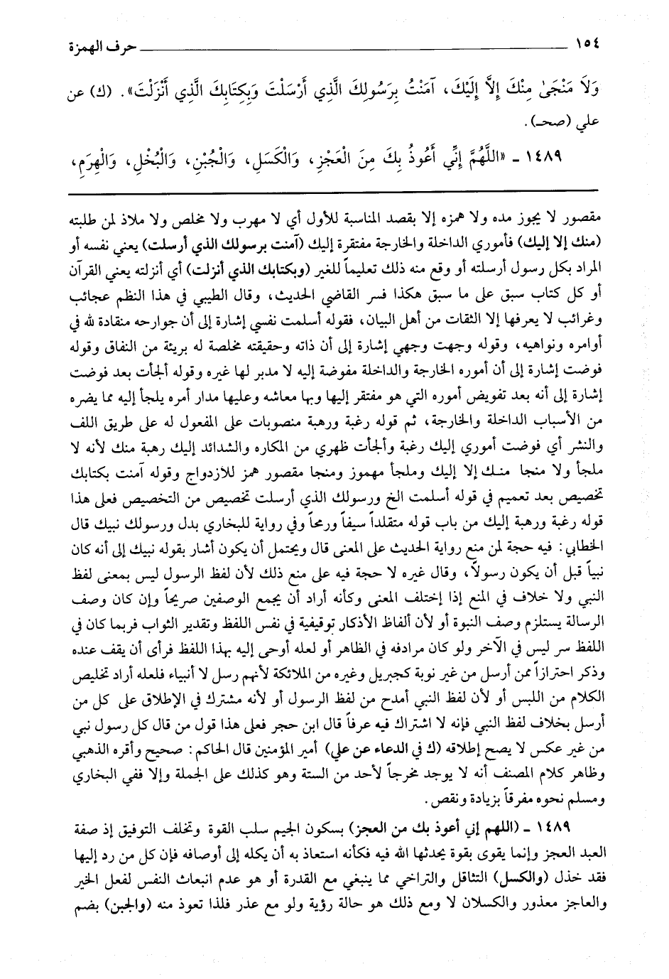 1489 - (اللهم إني أعوذ بك من العجز) بسكون الجيم سلب القوة وتخلف التوفيق إذ صفة العبد العجز وإنما يقوى بقوة يحدبها الله فيه فكأنه استعاذ به أن يكله إلى أوصافه فإن كل من رد إليها فقد خذل (والكسل) التثاقل والتراخي مما ينبغي مع القدرة أو هو عدم انبعاث النفس لفعل الخير والعاجز معذور والكسلان لا ومع ذلك هو حالة رؤية ولو مع عذر فلذا تعوذ منه (والجبن) بضم
