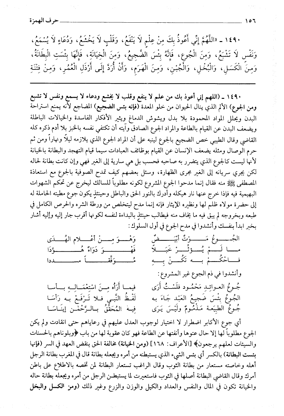 1490 - (اللهم إني أعوذ بك من علم لا ينفع وقلب لا يخشع ودعاء لا يسمع ونفس لا تشبع ومن الجوع) الألم الذي ينال الحيوان من خلو المعدة (فإنه بئس الضجيع) المضاجع لأنه يمنع استراحة البدل ويحلل المواد المحمودة بلا بدل ويشوش الدماغ ويثير الأفكار الفاسدة والخيالات الباطلة ويضعف البدن عن القيام بالطاعة والمراد الجوع الصادق وآيته أن تكتفي نفسه بالخبز بلا آدم ذكره كله