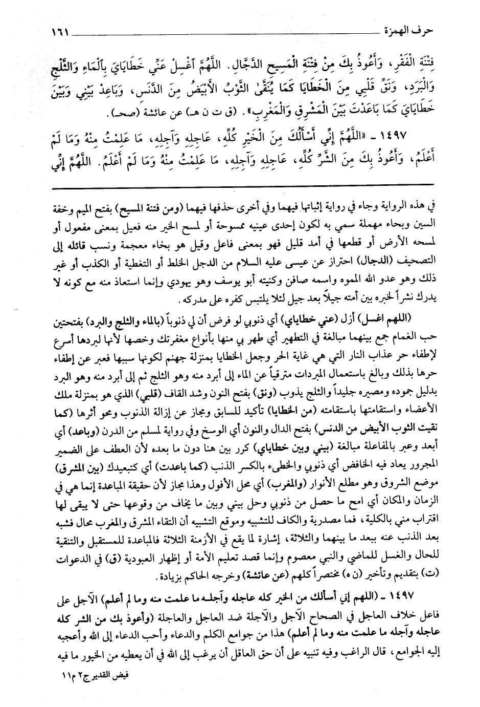 1497 - (اللهم إني أسألك من الخير كله عاجله وأجله ما علمت منه وما لم أعلم) الآجل على فاعل خلاف العاجل في الصحاح الآجل والآجلة ضد العاجل والعاجلة (وأعوذ بك من الشر كله عاجله وآجله ما علمت منه وما لم أعلم) هذا من جوامع الكلم والدعاء وأحب الدعاء إلى الله وأعجبه إليه الجوامع.