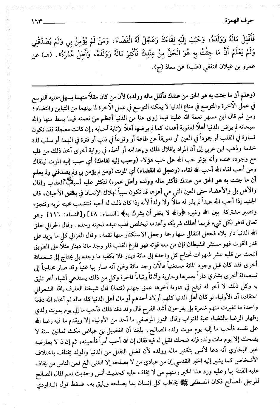 وقال الحراني خلق الله الدنيا دار بلاء فجعل التقلل منها رحمة وجعل الاستكثار منها نقمة ، وقال الغزالي كل ما يزيد على قدر القوت فهو مستقر الشيطان فإن من معه قوته فهو فارغ القلب فلو وجد مائة دينار مثلا على الطريق انبعث من قلبه عشر شهوات تحتاج كل واحدة إلى مائة دينار فلا يكفيه ما وجده بل يحتاج إلى تسعمائة أخرى فقد كان قبل وجود المائة مستغنيا فالآن وجد مائة وظن أنه صار بها غنيا وقد صار محتاجا إلى تسعمائة أخرى يشتري دارا يعمرها وجارية وأثاثا وثيابا فاخرة وكل من ذلك يستدعي أشياء أخر تليق به وكل ذلك لا آخر له فيقع في هاوية آخرها عمق جهنم (تتمة) قال شيخنا العارف بالله الشعراني اعتقادنا أن الأولياء لو كان أهل الدنيا كلهم أولاد أحدهم أو مال أهل الدنيا كله ماله ثم أخذه الله دفعة واحدة ما تغيرت منهم شعرة بل يفرحون أشد الفرح قال : وقد ذقنا ذلك فأحب ما إلى يوم يموت ولدي