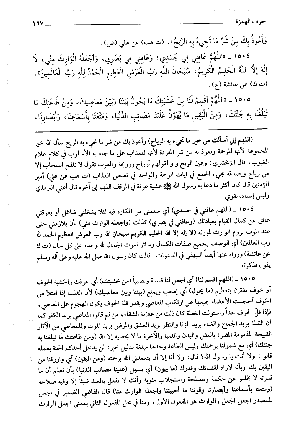 1504 - (اللهم عافني في جسدي) أي سلمني من المكاره فيه لئلا يشغلني شاغل أو يعوقني عائق عن كمال القيام بعبادتك (وعافني في بصري) كذلك (واجعله الوارث مني) بأن يلازمني حتى عند الموت لزوم الوارث لمورثه (لا إله إلا الله الحليم الكريم سبحان الله رب العرش العظيم الحمد لله رب العالمين) أي الوصف بجميع صفات الكمال وسائر نعوت الجمال لله وحده على كل حال (ت ك عن عائشة) ورواه عنها أيضا البيهقي في الدعوات.