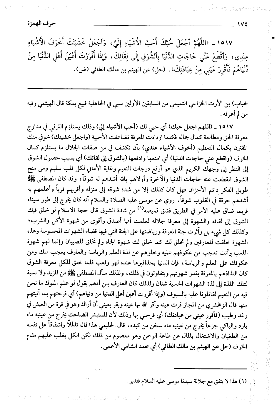 1517 - (اللهم اجعل حبك) أي حبي لك (أحب الأشياء إلي) وذلك يستلزم الترقي في مدارج معرفة الحق ومطالعة كمال جماله فكلما ازدادت المعرفة تضاعفت الأحبية (واجعل خشيتك) خوفي منك المقترن بكمال التعظيم (أخوف الأشياء عندي) بأن تكشف لي من صفات الجلال ما يستلزم كمال الخوف (واقطع عني حاجات الدنيا) أي امنعها وادفعها (بالشوق إلى لقائك) أي بسبب حصول الشوق إلى النظر إلى وجهك الكريم الذي هو أرفع درحات النعيم وغاية الأماني لكل قلب سليم ومن منح الشوق انقطعت عنه حاجات الدنيا والآخرة وأولاهم بالله أشدهم له شوقا ، وقد كان المصطفى صلى الله عليه وسلم طويل الفكر دائم الأحزان فهل كان كذلك إلا من شدة شوقه إلى منزله وأقربهم قربا وأعلمهم به أشدهم حرقة في القلوب ، روي عن موسى عليه الصلاة والسلام أنه كان يخرج إلى طور سيناء فربما ضاق عليه الأمر في الطريق فشق (1) قميصه من شدة الشوق قال حجة الإسلام لو خلق فيك الشوق إلى لقائه والشهوة إلى معرفة جلاله لعلمت أنها أصدق وأقوى من شهوة الأكل والشرب ، وكذلك كل شئ بل وآثرت جنة المعرفة ورياضتها على الجنة التي فيها قضاء الشهوات المحسوسة وهذه الشهوة خلقت للعارفين ولم تخلق لك كما خلق لك شهوة الجاه ولم تخلق للصبيان وإنما لهم شهوة اللعب وأنت تعجب من عكوفهم عليه وخلوهم عن لذة العلم والرياسة والعارف يعجب منك ومن