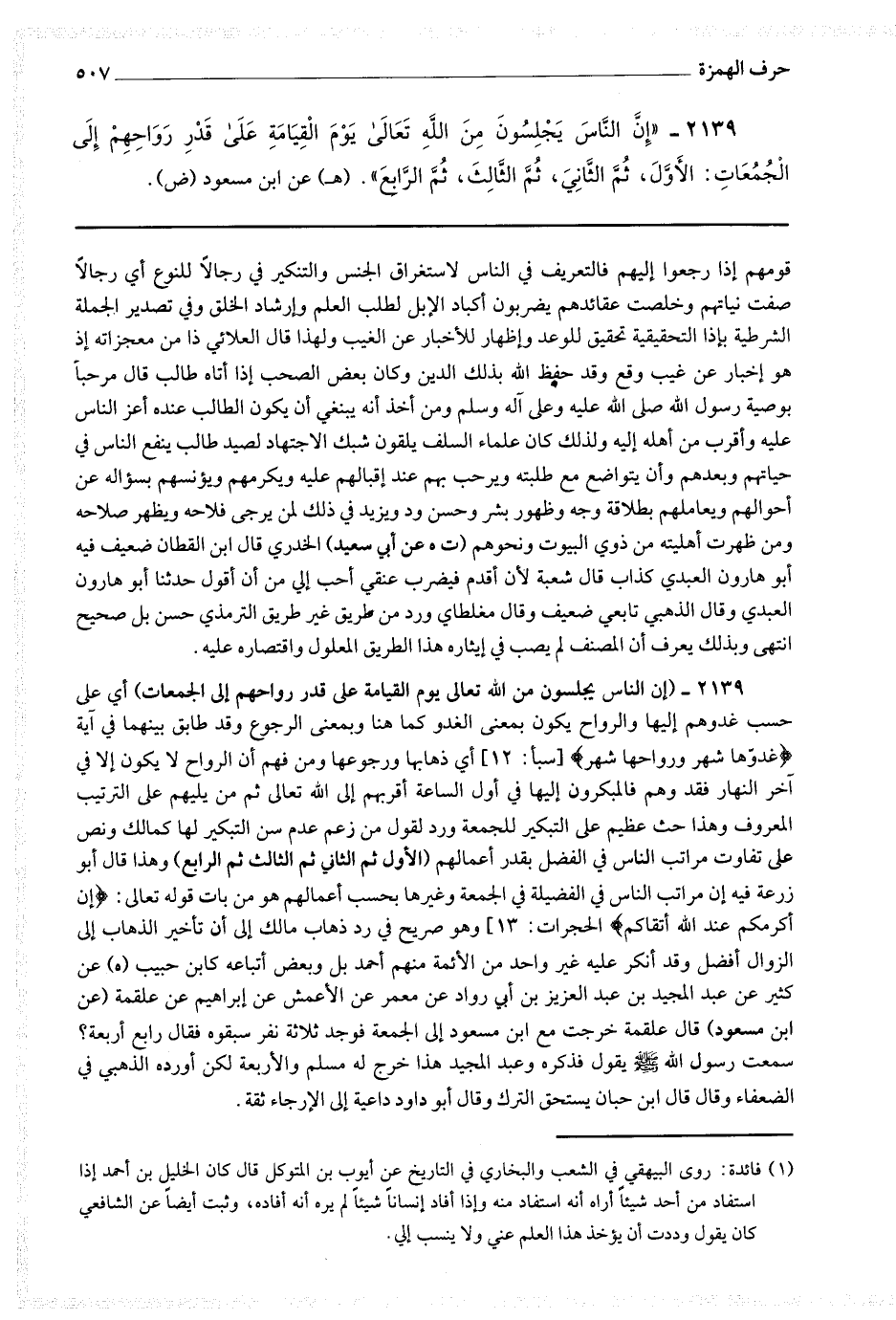 2139 - (إن الناس يجلسون من الله تعالى يوم القيامة على قدر رواحهم إلى الجمعات) أي على حسب غدوهم إليها والرواح يكون بمعنى الغدو كما هنا وبمعنى الرجوع وقد طابق بينهما في آية * (غدوها شهر ورواحها شهر) * [ سبأ : 12 ] أي ذهابها ورجوعها ومن فهم أن الرواح لا يكون إلا في آخر النهار فقد وهم فالمبكرون إليها في أول الساعة أقربهم إلى الله تعالى ثم من يليهم على الترتيب المعروف وهذا حث عظيم على التبكير للجمعة ورد لقول من زعم عدم سن التبكير لها كمالك ونص على تفاوت مراتب الناس في الفضل بقدر أعمالهم (الأول ثم الثاني ثم الثالث ثم الرابع) وهذا قال أبو زرعة فيه إن مراتب الناس في الفضيلة في الجمعة وغيرها بحسب أعمالهم وهو من بات قوله تعالى : * (إن أكرمكم عند الله أتقاكم) * [ الحجرات : 13 ] وهو صريح في رد ذهاب مالك إلى أن تأخير الذهاب إلى الزوال أفضل وقد أنكر عليه غير واحد من الأئمة منهم أحمد بل وبعض أتباعه كابن حبيب (ه) عن كثير عن عبد المجيد بن عبد العزيز بن أبي رواد عن معمر عن الأعمش عن إبراهيم عن علقمة (عن ابن مسعود) قال علقمة خرجت مع ابن مسعود إلى الجمعة فوجد ثلاثة نفر سبقوه فقال رابع أربعة ؟ سمعت رسول الله صلى الله عليه وسلم يقول فذكره وعبد المجيد هذا خرج له مسلم والأربعة لكن أورده الذهبي في الضعفاء وقال قال ابن حبان يستحق الترك وقال أبو داود داعية إلى الإرجاء ثقة.