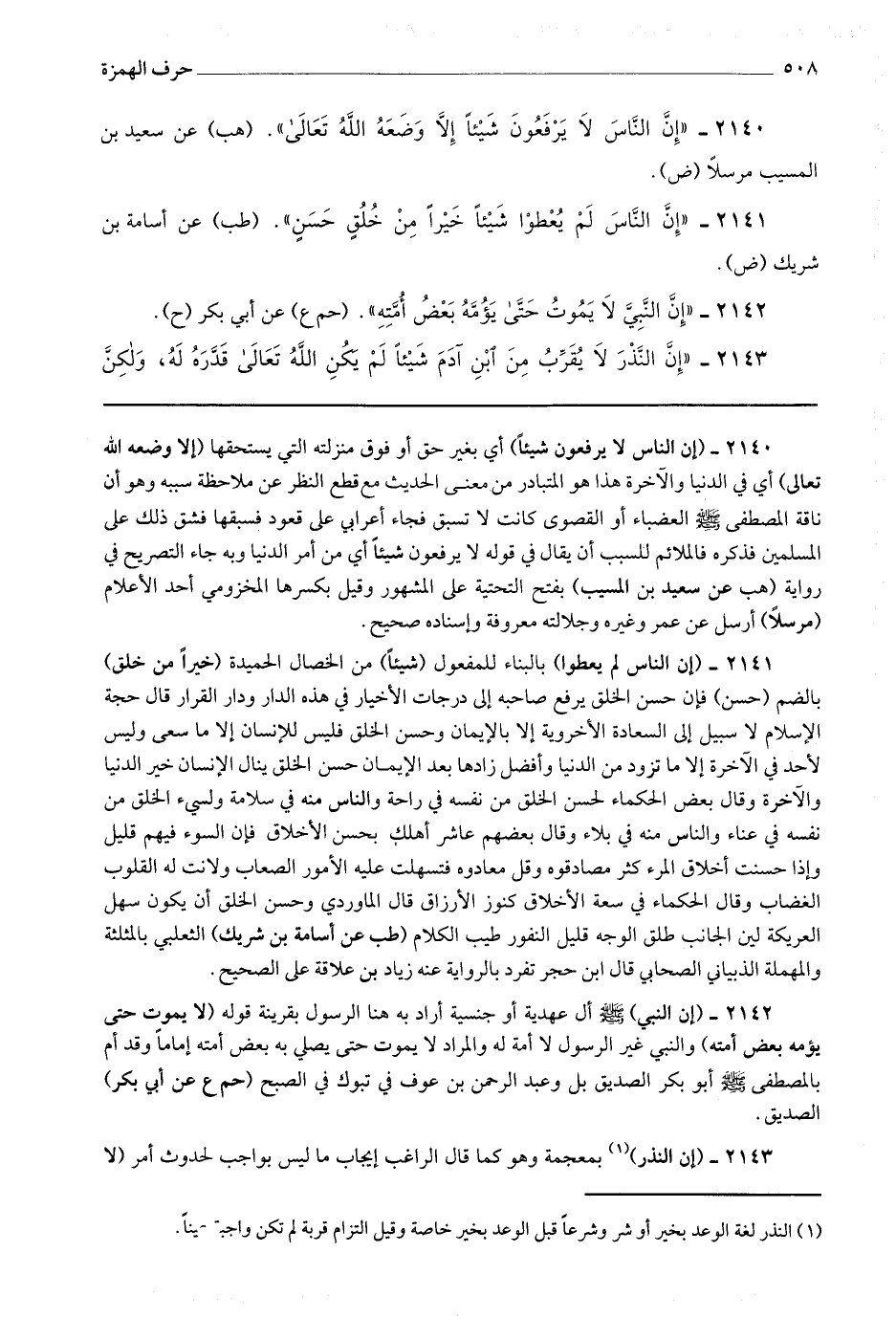 2140 - (إن الناس لا يرفعون شيئا) أي بغير حق أو فوق منزلته التي يستحقها (إلا وضعه الله تعالى) أي في الدنيا والآخرة هذا هو المتبادر من معنى الحديث مع قطع النظر عن ملاحظة سببه وهو أن ناقة المصطفى صلى الله عليه وسلم العضباء أو القصوى كانت لا تسبق فجاء أعرابي على قعود فسبقها فشق ذلك على المسلمين فذكره فالملائم للسبب أن يقال في قوله لا يرفعون شيئا أي من أمر الدنيا وبه جاء التصريح في رواية (هب عن سعيد بن المسيب) بفتح التحتية على المشهور وقيل بكسرها المخزومي أحد الأعلام (مرسلا) أرسل عن عمر وغيره وجلالته معروفة وإسناده صحيح.