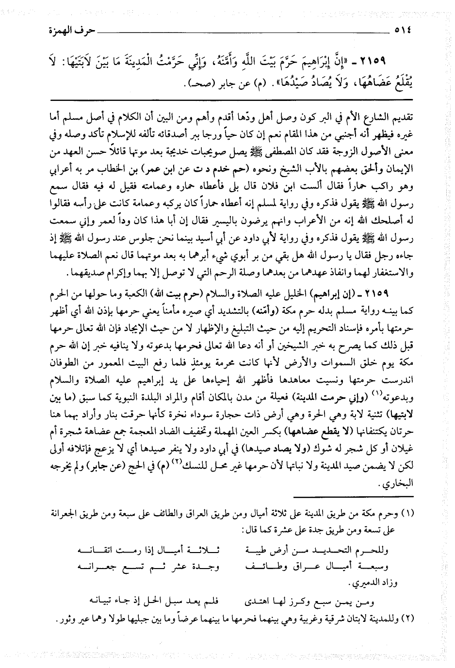 (1) وحرم مكة من طريق المدينة على ثلاثة أميال ومن طريق العراق والطائف على سبعة ومن طريق الجعرانة على تسعة ومن طريق جدة على عشرة كما قال : وللحرم التحديد من أرض طيبة * * ثلاثة أميال إذا رمت اتقانه وسبعة أميال عراق وطائف * * وجدة عشر ثم تسع جعرانة