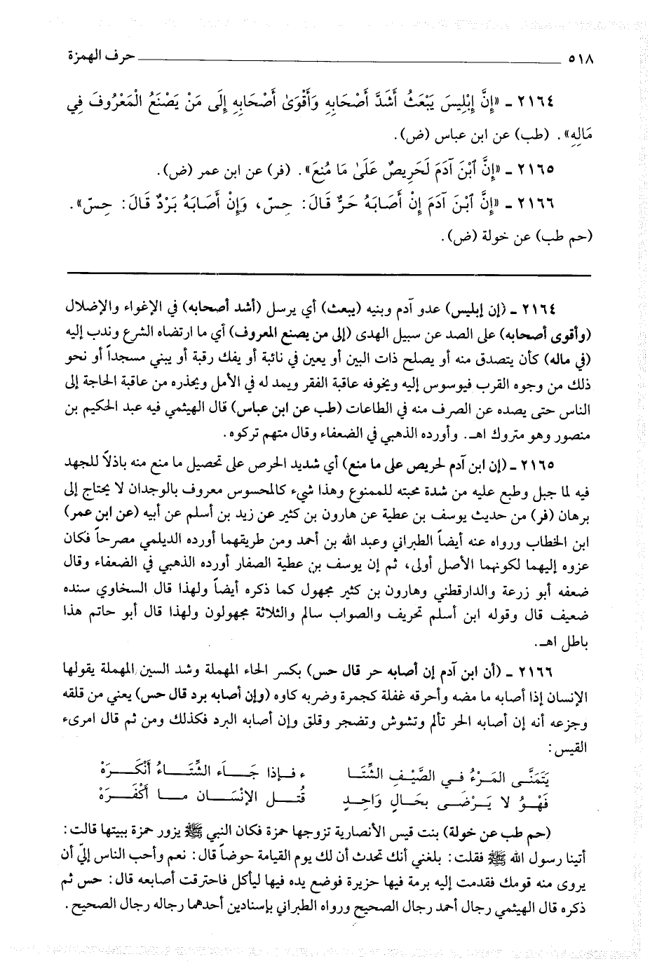 2166 - (إم ابن آدم إن أصابه حر قال حس) بكسر الحاء المهملة وشد السين المهملة يقولها الإنسان إذا أصابه ما مضه وأحرقه غفلة كجمرة وضربه كاوه (وإن أصابه برد قال حس) يعني من قلقه وجزعه أنه إن أصابه الحر تألم وتشوش وتضجر وقلق وإن أصابه البرد فكذلك ومن ثم قال امرئ القيس : يتمنى المرء في الصيف الشتاء * * فإذا جاء الشتاء أنكره فهو لا يرضى بحال واحد * * قتل الإنسان ما أكفره (حم طب عن خولة) بنت قيس الأنصارية تزوجها حمزة فكان النبي صلى الله عليه وسلم يزور حمزة ببيتها قالت : أتينا رسول الله صلى الله عليه وسلم فقلت بلغني أنك تحدث أن لك يوم القيامة حوضا قال : نعم وأحب الناس إلي أن يروى منه قومك فقدمت إليه برمة فيها حزيرة فوضع يده فيها ليأكل فاحترقت أصابعه قال : حس ثم