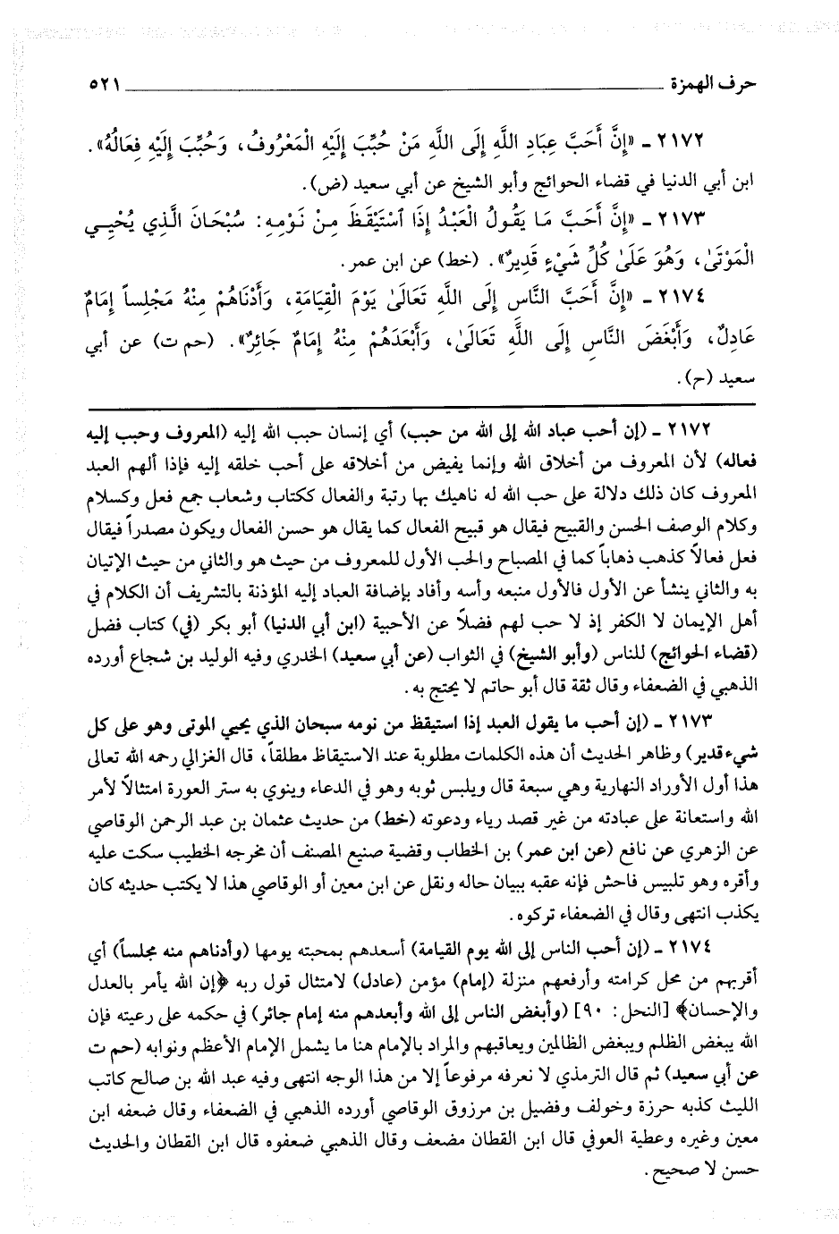 2173 - (إن أحب ما يقول العبد إذا استيقظ من نومه سبحان الذي يحيي الموتى وهو على كل شئ قدير) وظاهر الحديث أن هذه الكلمات مطلوبة عند الاستيقاظ مطلقا قال الغزالي رحمه الله تعالى