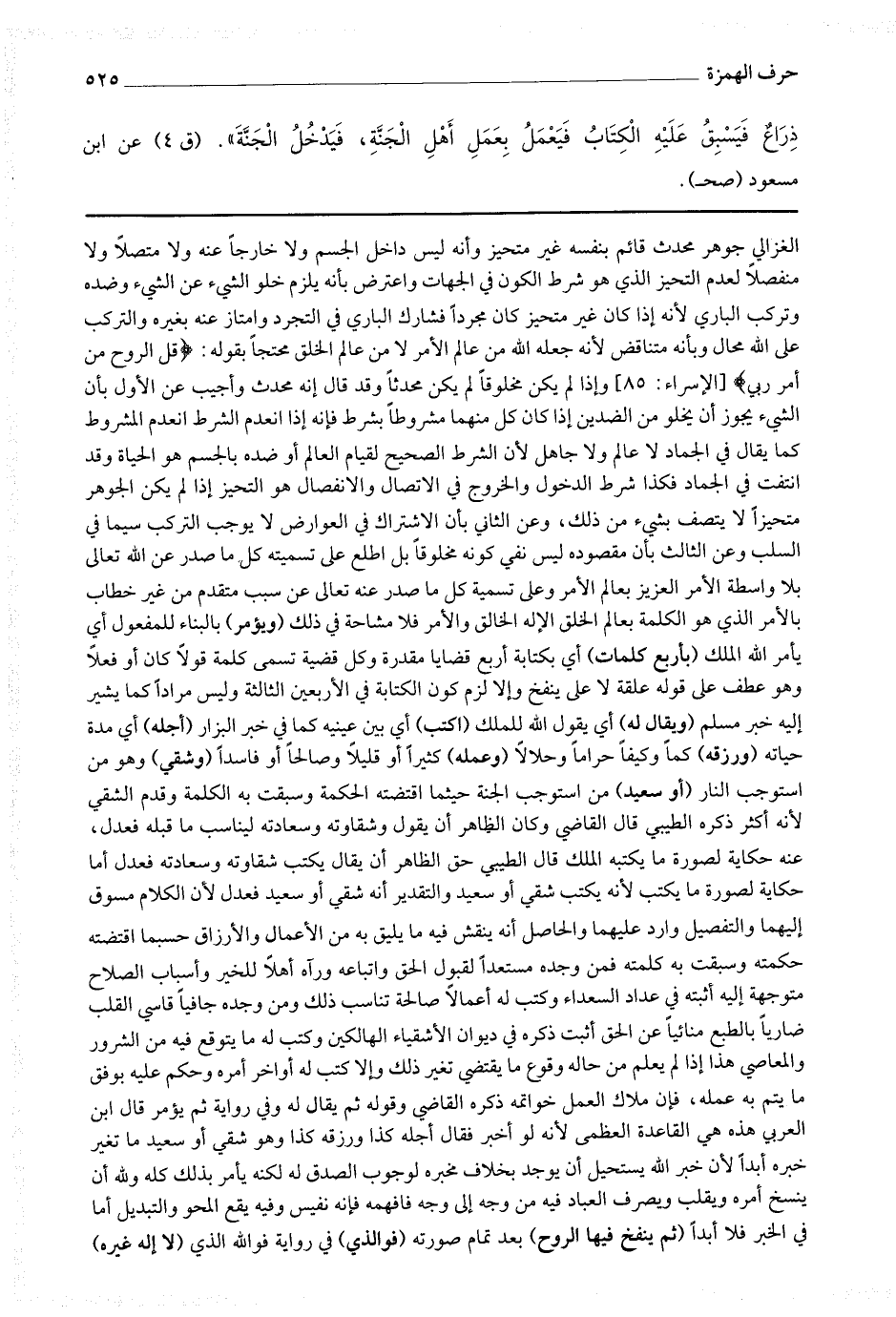 الغزالي جوهر محدث قائم بنفسه غير متحيز وأنه ليس داخل الجسم ولا خارجا عنه ولا متصلا ولا منفصلا لعدم التحيز الذي هو شرط الكون في الجهات واعترض بأنه يلزم خلو الشئ عن الشئ وضده وتركب الباري لأنه إذا كان غير متحيز كان مجردا فشارك الباري في التجرد وامتاز عنه بغيره والتركب على الله محال وبأنه متناقض لأنه جعله الله من عالم الأمر لا من عالم الخلق محتجا بقوله : * (قل الروح من أمر ربي) * وإذا لم يكن مخلوقا لم يكن محدثا وقد قال إنه محدث وأجيب عن الأول بأن الشئ يجوز أن يخلو من الضدين إذا كان كل منهما مشروطا بشرط فإنه إذا انعدم الشرط انعدم المشروط كما يقال في الجماد لا عالم ولا جاهل لأن الشرط الصحيح لقيام العالم أو ضده بالجسم هو الحياة وقد انتفت في الجماد فكذا شرط الدخول والخروج في الاتصال والانفصال هو التحيز إذا لم يكن الجوهر متحيزا لا يتصف بشئ من ذلك وعن الثاني بأن الاشتراك في العوارض لا يوجب التركب سيما في السلب وعن الثالث بأن مقصوده ليس نفي كونه مخلوقا بل اطلع على تسميته كل ما صدر عن الله تعالى بلا واسطة الأمر العزيز بعالم الأمر وعلى تسمية كل ما صدر عنه تعالى عن سبب متقدم من غير خطاب بالأمر الذي هو الكلمة بعالم الخلق الإله الخالق والأمر فلا مشاحة في ذلك (ويؤمر) بالبناء للمفعول أي يأمر الله الملك (بأربع كلمات) أي بكتابة أربع قضايا مقدرة وكل قضية تسمى كلمة قولا كان أو فعلا وهو عطف على قوله علقة لا على ينفخ وإلا لزم كون الكتابة في الأربعين الثالثة وليس مرادا كما يشير إليه خبر مسلم (ويقال له) أي يقول الله للملك (اكتب) أي بين عينيه كما في خبر البزار (أجله) أي مدة حياته (ورزقه) كما وكيفا حراما وحلالا (وعمله) كثيرا أو قليلا وصالحا أو فاسدا (وشقي) وهو من استوجب النار (أو سعيد) من استوجب الجنة حيثما اقتضته الحكمة وسبقت به الكلمة وقدم الشقي