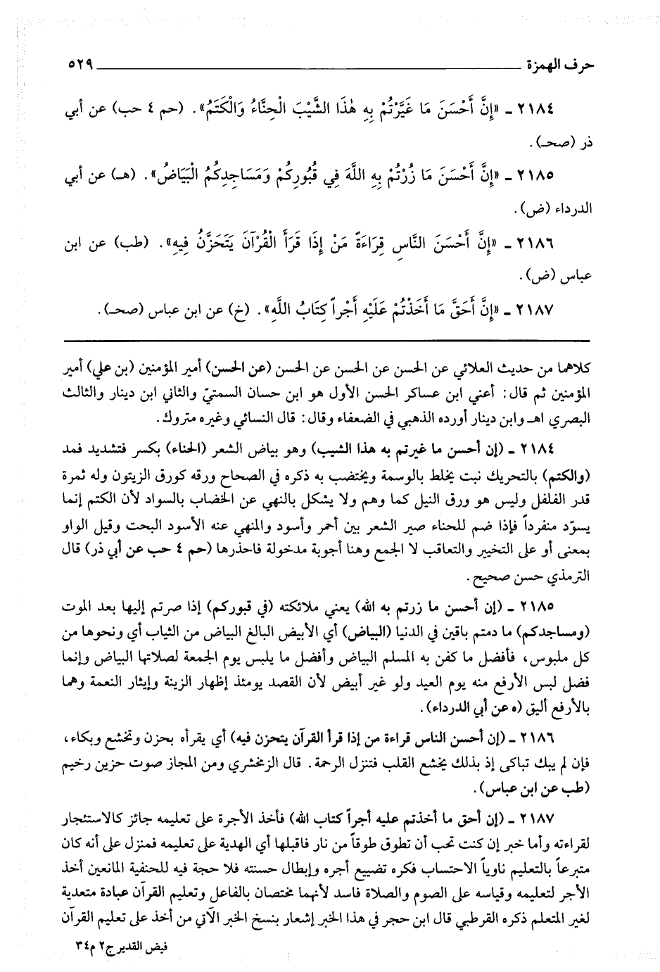 2186 - (إن أحسن الناس قراءة من إذا قرأ القرآن يتحزن فيه) أي يقرؤه بحزن وتخشع وبكاء ، فإن لم يبك تباكى إذ بذلك يخشع القلب فتنزل الرحمة.