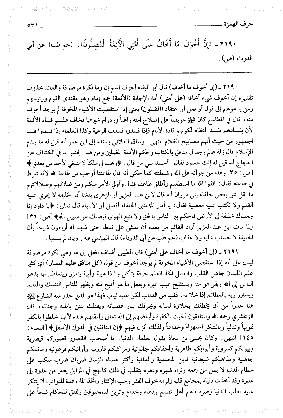 2191 - (إن أخوف ما أخاف على أمتي) قال الطيبي أضاف أفعل إلى ما وهي نكرة موصوفة ليدل على أنه إذا استقصى الأشياء المخوفة لم يوجد أخوف من قول (كل منافق عليم اللسان) أي كثير علم اللسان جاهل القلب والعمل اتخذ العلم حرفة يتأكل بها ذا هيبة وأبهة يتعزز ويتعاظم بها يدعو الناس إلى الله ويفر هو منه ويستقبح عيب غيره ويفعل ما هو أقبح منه ويظهر للناس التنسك والتعبد ويسارر ربه بالعظائم إذا خلا به ذئب من الذئاب لكن عليه ثياب فهذا هو الذي حذر منه الشارع صلى الله عليه وسلم هنا حذرا من أن يخطفك بحلاوة لسانه ويحرقك بنار عصيانه ويقتلك بنتن باطنه وجنانه ، قال الزمخشري رحمه الله والمنافقون أخبث الكفرة وأبغضهم إلى الله تعالى وأمقتهم عنده لأنهم خلطوا بالكفر تمويها وتدليا وبالشكر استهزاء وخداعا ولذلك أنزل فيهم * (إن المنافقين في الدرك الأسفل) * [ ا لنساء :