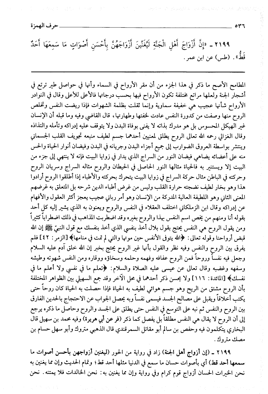 2199 - (إن أزواج أهل الجنة) زاد في رواية من الحور (ليغنين أزواجهن بأحسن أصوات ما سمعها أحد قط) أي بأصوات حسان ما سمع في الدنيا مثلها أحد قط ، وتمام الحديث وإن مما يغنين به نحن الخيرات الحسان أزواج قوم كرام وفي رواية وإن مما يغنين به : نحن الخالدات فلا يمتنه.