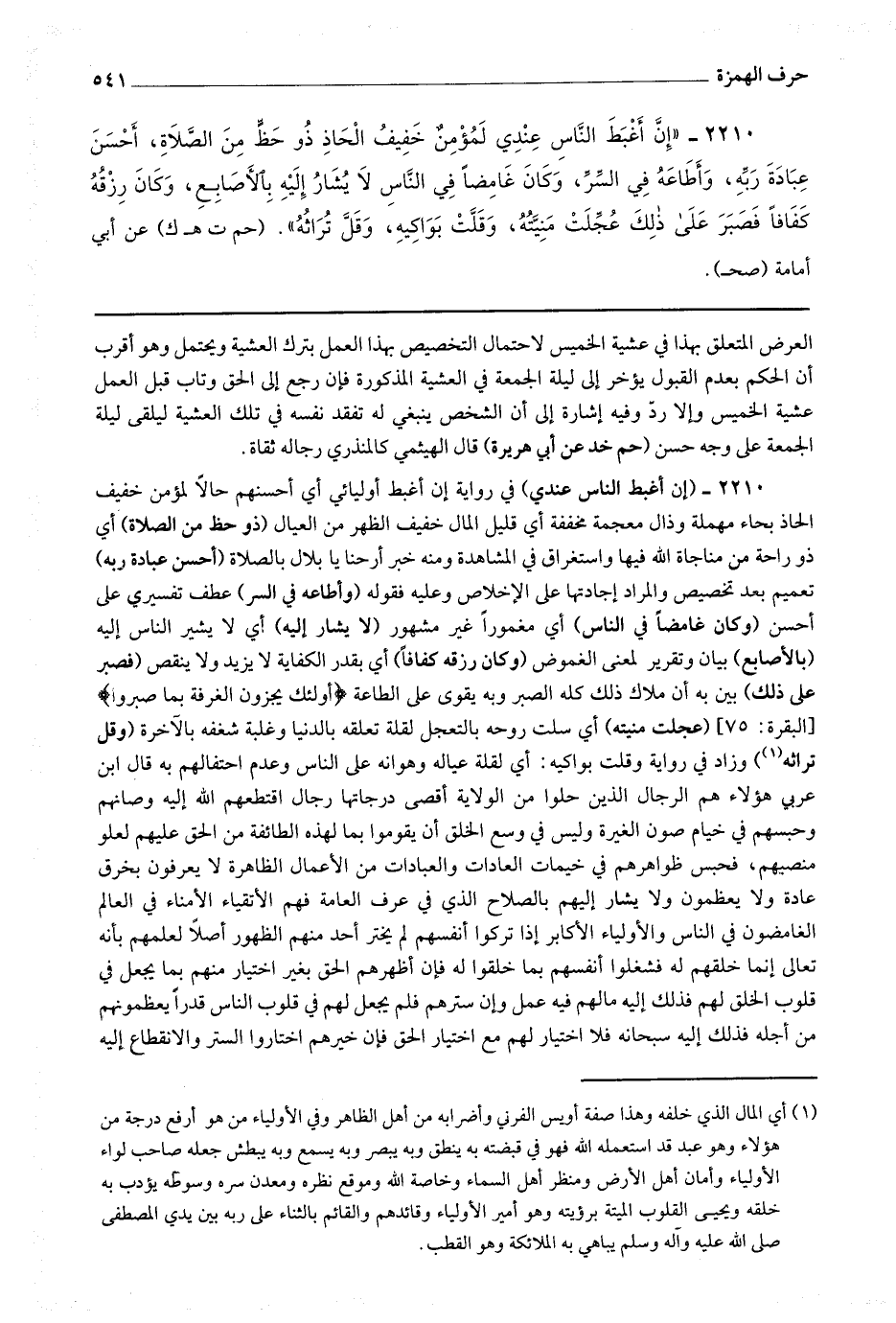 (1) أي المال الذي خلفه وهذا صفة أويس الفرني وأضرابه من أهل الظاهر وفي الاولياء من هو أرفع درجة من هؤلاء وهو عبد قد استعمله الله فهو في قبضته به ينطق وبه يبصر وبه يسمع وبه يبطش جعله جعله صاحب لواء الاولياء وأمان أهل الارض ومنظر أهل السماء وخاصة الله وموقع نظره ومعدن سره وسوطه يؤدب به خلقه ويحيى القلوب الميتة برؤيته وهو أمير الاولياء وقائدهم والقائم بالثناء على ربه بين يدي المصطفى صلى الله عليه وآله وسلم يباهي به الملائكة وهو القطب.