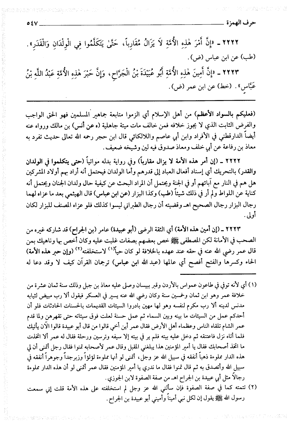 2223 - (إن أمين هذه الأمة) أي الثقة الرضي (أبو عبيدة) عامر (بن الجراح) قد شاركه غيره من الصحب في الأمانة لكن المصطفى صلى الله عليه وسلم خص بعضهم بصفات غلبت عليه وكان أخص بها وناهيك بمن قال عمر رضي الله عنه في حقه عند عهده بالخلافة لو كان حيا (1) لاستخلفته (2) (وإن حبر هذه الأمة) بفتح الحاء وكسرها والفتح أفصح أي عالمها (عبد الله ابن عباس) ترجمان القرآن كيف لا وقد دعا له
