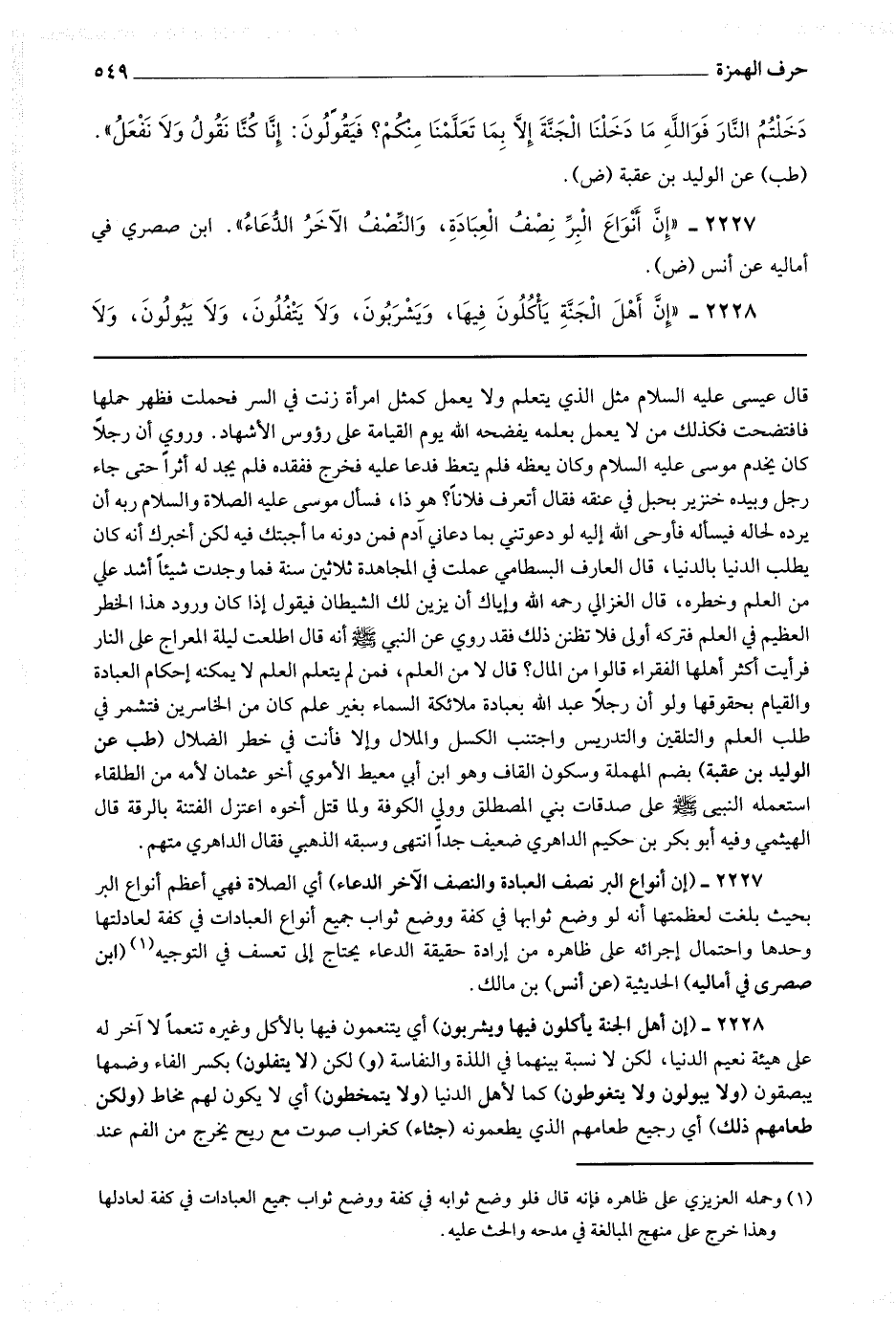 2227 - (إن أنواع البر نصف العبادة والنصف الآخر الدعاء) أي الصلاة فهي أعظم أنواع البر بحيث بلغت لعظمتها أنه لو وضع ثوابها في كفة ووضع ثواب جميع أنواع العبادات في كفة لعادلتها وحدها واحتمال إجرائه على ظاهره من إرادة حقيقة الدعاء يحتاج إلى تعسف في التوجيه (1) (ابن صصري في أماليه) الحديثية (عن أنس) بن مالك.