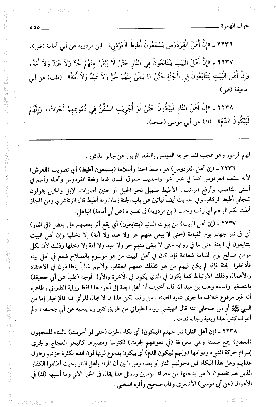 2238 - (إن أهل النار) نار جهنم (ليبكون) أي بكاء الحزن (حتى لو أجريت) بالبناء للمجهول (السفن) جمع سفينة وهي معروفة (في دموعهم لجرت) لكثرتها ومصيرها كالبحر العجاج والجري إسراع حركة الشئ ودوامها (وإنهم ليبكون الدم) أي يبكون بدموع لونها لون الدم لكثرة حزنهم وطول عذابهم وهل هذا البكاء قبل دخولهم النار أو بعده ومن البين أن المراد بأهل النار بحيث أطلقوا الكفار الذين هم مخلدون لا من يدخلها من عصاة المؤمنين وبمثل هذا يقال في الخبر الآتي وما أشبهه (ك) في الأهوال (عن أبي موسى) الأشعري وقال صحيح وأقره الذهبي.