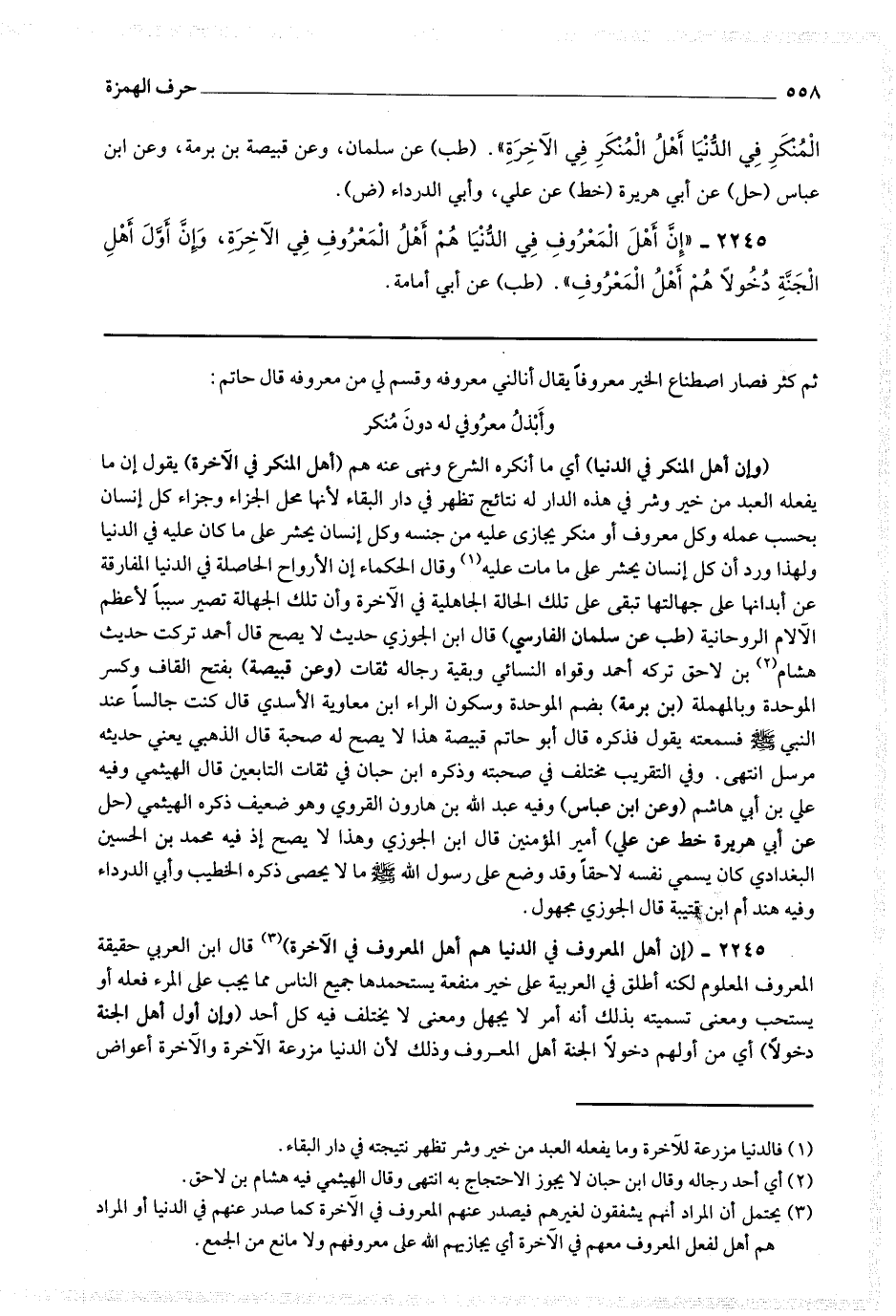2245 - (إن أهل المعروف في الدنيا هم أهل المعروف في الآخرة (3) قال ابن العربي حقيقة المعروف المعلوم لكنه أطلق في العربية على خير منفعة يستحمدها جميع الناس مما يجب على المرء فعله أو يستحب ومعنى تسميته بذلك أنه أمر لا يجهل ومعنى لا يختلف فيه كل أحد (وإن أول أهل الجنة دخولا) أي من أولهم دخولا الجنة (أهل المعروف) وذلك لأن الدنيا مزرعة الآخرة والآخرة أعواض