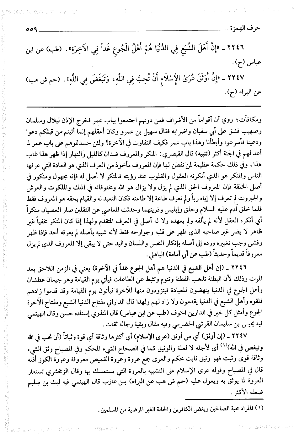 2247 - (إن أوثق) أي من أوثق (عرى الإسلام) أي أكثرها وثاقة أي قوة وثباتا (أن تحب في الله وتبغض في الله) (1) أي لأجله لا لعلة والوثيق كما في الصحاح الشئ المحكم وفي المصباح وثق الشئ وثاقة قوي وثبت فهو وثيق ثابت محكم والعرى جمع عروة وعروة القميص معروفة وعروة الكوز أذنه قال في المصباح وقوله عرى الإسلام على التشبيه بالعروة التي يستمسك بها وقال الزمخشري تستعار العروة لما يوثق به ويعول عليه (حم ش هب عن البراء) ابن عازب قال الهيثمي فيه ليث بن سليم
