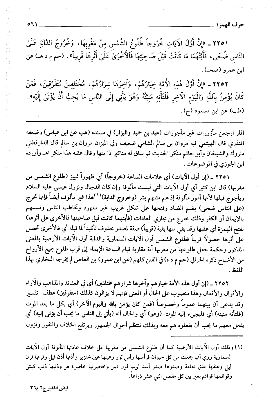 2251 - (إن أول الآيات) أي علامات الساعة (خروجا) أي ظهورا تمييز (طلوع الشمس من مغربها) قال ابن كثير أي أول الآيات التي ليست مألوفة وإن كان الدجال ونزول عيسى عليه السلام ويأجوج قبلها لأنها أمور مألوفة إذ هم مثلهم بشر (وخروج الدابة) (1) هذا غير مألوف أيضا فإنها تخرج (على الناس ضحى) بضم الضاد وفتحها على شكل غريب غير معهود وتخاطب الناس وتسمهم بالإيمان أو الكفر وذلك خارج من مجاري العادات (فأيتهما كانت قبل صاحبتيها فالأخرى على أثرها) بفتح الهمزة أي عقبها وقد بقي منها بقية (قريبا) صفة لمصدر محذوف تأكيدا لما قبله أي فالأخرى تحصل على أثرها حصولا قريبا فطلوع الشمس أول الآيات السماوية والدابة أول الآيات الأرضية بالمعنى المذكور وحكمة جعل طلوعها من مغربها آية مقاربة قيام الساعة الإيماء إلى قرب طلوع جميع الأرواح من الأشباح ذكره الحرالي (حم م د ه) في الفتن كلهم (عن ابن عمر) بن العاص لم يخرجه البخاري بهذا اللفظ.