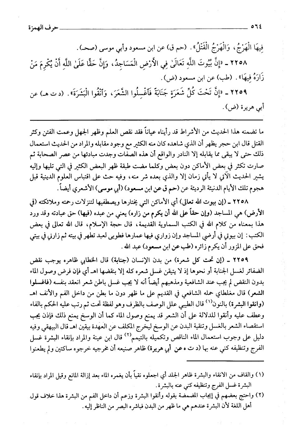 2259 - (إن تحت كل شعرة) من بدن الإنسان (جنابة) قال الخطابي ظاهره يوجب نقض الضفائر لغسل الجنابة أو نحوها إذ لا يتيقن غسل شعره كله إلا بنقضها اه أي فإن فرض وصول الماء بدون النفض لم يجب عند الشافعية ومذهبهم أيضا أنه لا يجب غسل باطن شعر انعقد بنفسه (فاغسلوا الشعر) قال مغلطاي حمله الشافعي في القديم على ما ظهر دون ما بطن من داخل الفم والأنف اه (وانقوا البشرة) بالنون (1) قال الطيبي علل الوصف بالظرف وهو لفظه تحت ثم رتب عليه الحكم بالفاء وعطف عليه وأنقوا للدلالة على أن الشعر قد يمنع وصول الماء كما أن الوسخ يمنع ذلك فإذن يجب استقصاء الشعر بالغسل وتنقية البدن عن الوسخ ليخرج المكلف عن العهدة بيقين اه قال البهيقي وفيه دليل على وجوب استعمال الماء الناقص وتكميله بالتيمم (2) قال ابن عيينة والمراد بإنقاء البشرة غسل الفرج وتنظيفه كنى عنه بها (د ت ه عن أبي هريرة) ظاهر صنيعه أن مخرجيه خرجوه ساكتين ولم يطعنوا