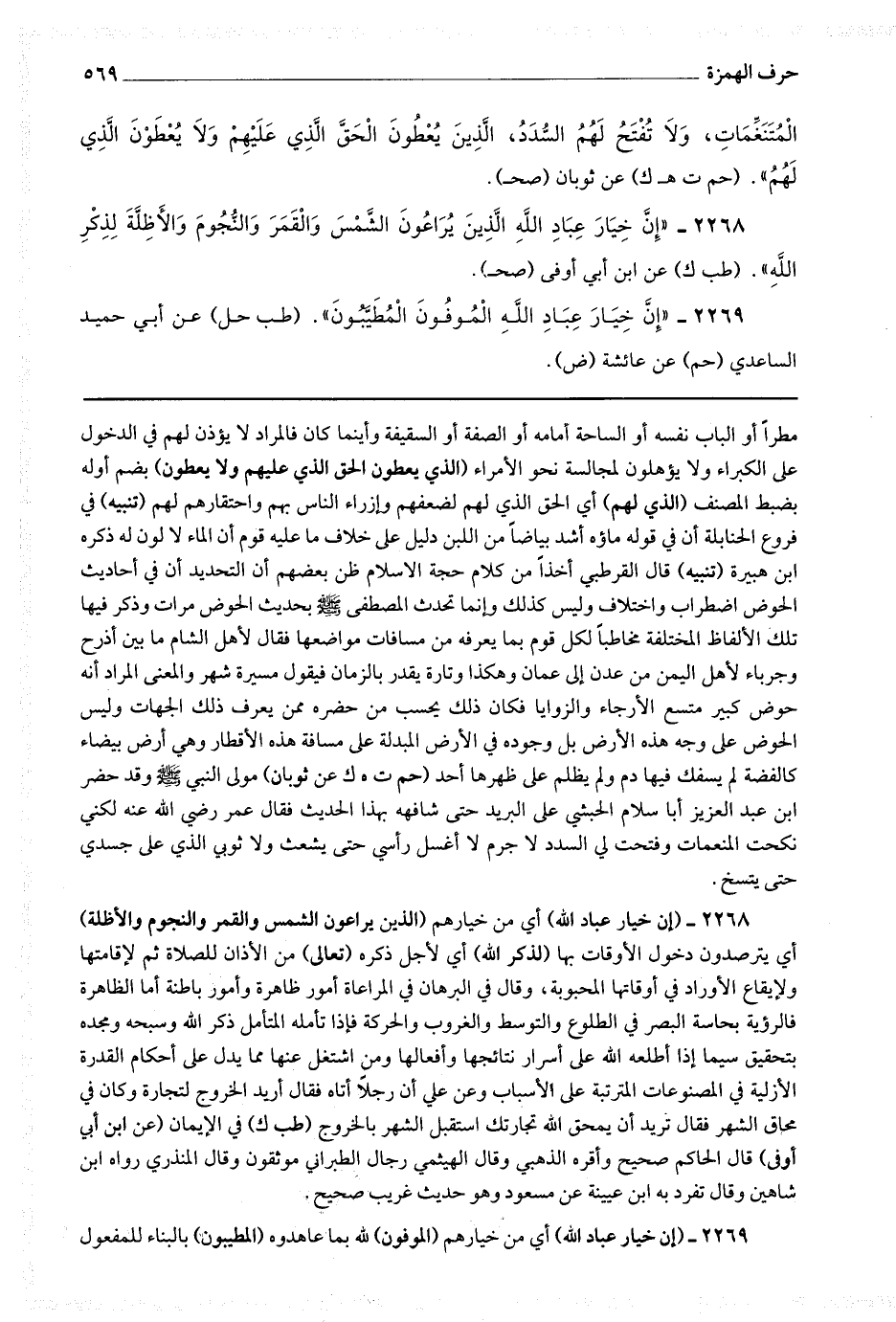 2268 - (إن خيار عباد الله) أي من خيارهم (الذين يراعون الشمس والقمر والنجوم والأظلة) أي يترصدون دخول الأوقات بها (لذكر الله) أي لأجل ذكره (تعالى) من الأذان للصلاة ثم لإقامتها ولإيقاع الأوراد في أوقاتها المحبوبة وقال في البرهان في المراعاة أمور ظاهرة وأمور باطنة أما الظاهرة فالرؤية بحاسة البصر في الطلوع والتوسط والغروب والحركة فإذا تأمله المتأمل ذكر الله وسبحه ومجده بتحقيق سيما إذا أطلعه الله على أسرار نتائجها وأفعالها ومن اشتغل عنها مما يدل على أحكام القدرة الأزلية في المصنوعات المترتبة على الأسباب وعن علي أن رجلا أتاه فقال أريد الخروج لتجارة وكان في محاق الشهر فقال تريد أن يمحق الله تجارتك استقبل الشهر بالخروج (طب ك) في الإيمان (عن ابن أبي أوفى) قال الحاكم صحيح وأقره الذهبي وقال الهيثمي رجال الطبراني موثقون وقال المنذري رواه ابن شاهين وقال تفرد به ابن عيينة عن مسعود وهو حديث غريب صحيح.