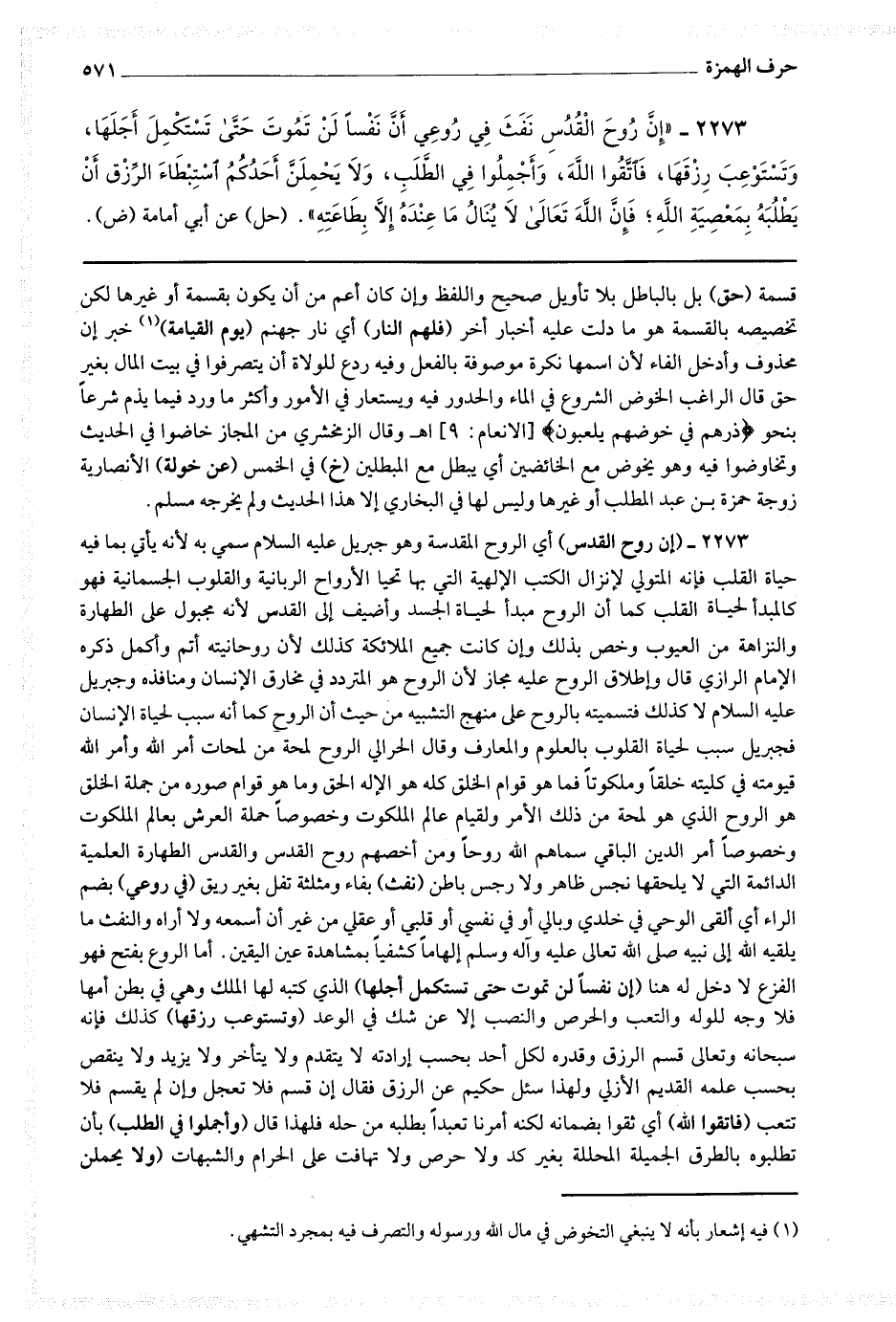 2273 - (إن روح القدس) أي الروح المقدسة وهو جبريل عليه السلام سمي به لأنه يأتي بما فيه حياة القلب فإنه المتولي لإنزال الكتب الإلهية التي بها تحيا الأرواح الربانية والقلوب الجسمانية فهو كالمبدأ لحياة القلب كما أن الروح مبدأ لحياة الجسد وأضيف إلى القدس لأنه مجبول على الطهارة والنزاهة من العيوب وخص بذلك وإن كانت جميع الملائكة كذلك لأن روحانيته أتم وأكمل ذكره الإمام الرازي قال وإطلاق الروح عليه مجاز لأن الروح هو المتردد في مخارق الإنسان ومنافذه وجبريل عليه السلام لا كذلك فتسميته بالروح على منهج التشبيه من حيث أن الروح كما أنه سبب لحياة الإنسان فجبريل سبب لحياة القلوب بالعلوم والمعارف وقال الحرالي الروح لمحة من لمحات الله وأمر الله قيومته في كليته خلقا وملكوتا فما هو قوام الخلق كله هو الإله الحق وما هو قوام صوره من جملة الخلق هو الروح الذي هو لمحة من ذلك الأمر ولقيام عالم الملكوت وخصوصا حملة العرش بعالم الملكوت وخصوصا أمر الدين الباقي سماهم الله روحا ومن أخصهم روح القدس والقدس الطهارة العلمية الدائمة التي لا يلحقها نجس ظاهر ولا رجس باطن (نفث) بفاء ومثلثة تفل بغير ريق (في روعي) بضم الراء أي ألقى الوحي في خلدي وبالي أو في نفسي أو قلبي أو عقلي من غير أن أسمعه ولا أراه والنفث ما يلقيه الله إلى نبيه صلى الله تعالى عليه وآله وسلم إلهاما كشفيا بمشاهدة عين اليقين.