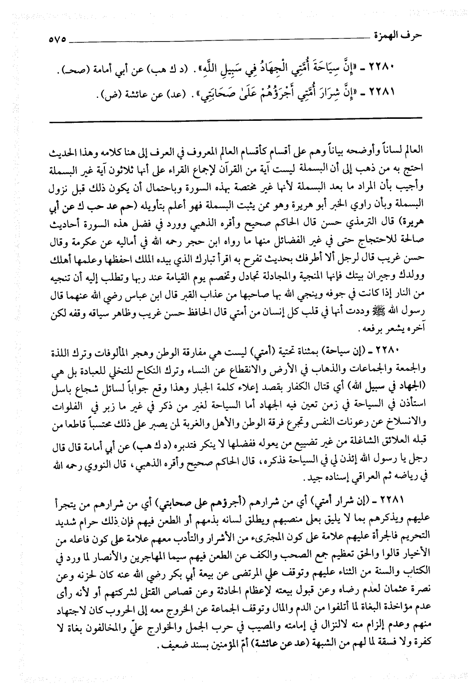 2280 - (إن سياحة) بمثناة تحتية (أمتي) ليست هي مفارقة الوطن وهجر المألوفات وترك اللذة والجمعة والجماعات والذهاب في الأرض والانقطاع عن النساء وترك النكاح للتخلي للعبادة بل هي (الجهاد في سبيل الله) أي قتال الكفار بقصد إعلاء كلمة الجبار وهذا وقع جوابا لسائل شجاع باسل استأذن في السياحة في زمن تعين فيه الجهاد أما السياحة لغير من ذكر في غير ما زبر في الفلوات والانسلاخ عن رعونات النفس وتجرع فرقة الوطن والأهل والغربة لمن يصير على ذلك محتسبا قاطعا من قبله العلائق الشاغلة من غير تضييع من يعوله ففضلها لا ينكر فتدبره (د ك هب) عن أبي أمامة قال قال رجل يا رسول الله ائذن لي في السياحة فذكره ، قال الحاكم صحيح وأقره الذهبي ، قال النووي رحمه الله في رياضه ثم العراقي إسناده جيد.