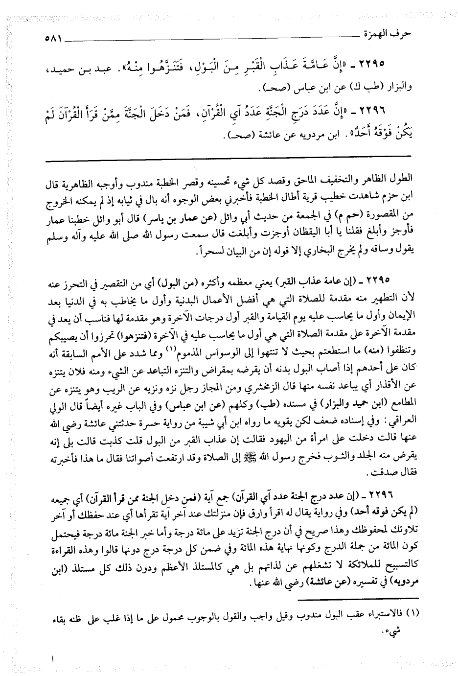 2295 - (إن عامة عذاب القبر) يعني معظمه وأكثره (من البول) أي من التقصير في التحرز عنه لأن التطهير منه مقدمة للصلاة التي هي أفضل الأعمال البدنية وأول ما يخاطب به في الدنيا بعد الإيمان وأول ما يحاسب عليه يوم القيامة والقبر أول درجات الآخرة وهو مقدمة لها فناسب أن يعد في مقدمة الآخرة على مقدمة الصلاة التي هي أول ما يحاسب عليه في الآخرة (فتنزهوا) تحرزوا أن يصيبكم وتنظفوا (منه) ما استطعتم بحيث لا تنتهوا إلى الوسواس المذموم (1) ومما شدد على الأمم السابقة أنه كان على أحدهم إذا أصاب البول بدنه أن بقرضه بمقراض والتنزه التباعد عن الشئ ومنه فلان يتنزه عن الأقذار أي يباعد نفسه منها قال الزمخشري ومن المجاز رجل نزه ونزيه عن الريب وهو يتنزه عن المطامع (ابن حميد والبزار) في مسنده (طب) وكلهم (عن ابن عباس) وفي الباب غيره أيضا قال الولي العراقي وفي إسناده ضعف لكن يقويه ما رواه ابن أبي شيبة من رواية حسرة حدثتني عائشة رضي الله عنها قالت دخلت على امرأة من اليهود فقالت إن عذاب القبر من البول قلت كذبت قالت بلى أنه يقرض منه الجلد والثوب فخرج رسول الله صلى الله عليه وسلم إلى الصلاة وقد ارتفعت أصواتنا ما هذا فأخبرته فقال صدقت.