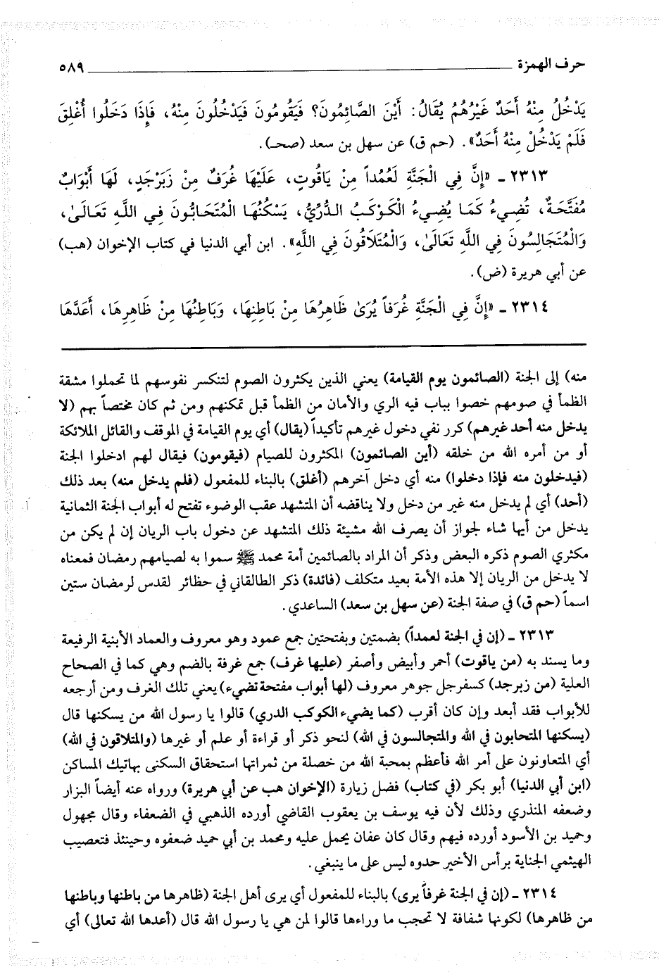 2313 - (إن في الجنة لعمدا) بضمتين وبفتحتين جمع عمود وهو معروف والعماد الأبنية الرفيعة وما يسند به (من ياقوت) أحمر وأبيض وأصفر (عليها غرف) جمع غرفة بالضم وهي كما في الصحاح العلية (من زبرجد) كسفرجل جوهر معروف (لها أبواب مفتحة تضئ) يعني تلك الغرف ومن أرجعه للأبواب فقد أبعد وإن كان أقرب (كما يضئ الكوكب الدري) قالوا يا رسول الله من يسكنها قال (يسكنها المتحابون في الله والمتجالسون في الله) لنحو ذكر أو قراءة أو علم أو غيرها (والمتلاقون في الله) أي المتعاونون على أمر الله فأعظم بمحبة الله من خصلة من ثمراتها استحقاق السكنى بهاتيك المساكن (ابن ابي الدنيا) أبو بكر (في كتاب) فضل زيارة (الإخوان هب عن أبي هريرة) ورواه عنه أيضا البزار وضعفه المنذري وذلك لأن فيه يوسف بن يعقوب القاضي وأورده الذهبي في الضعفاء وقال مجهول وحميد بن الأسود وأورده فيهم وقال كان عفان يحمل عليه ومحمد بن أبي حميد وضعفوه وحينئذ فتعصيب الهيثمي الجناية برأس الأخير حدوه ليس على ما ينبغي.