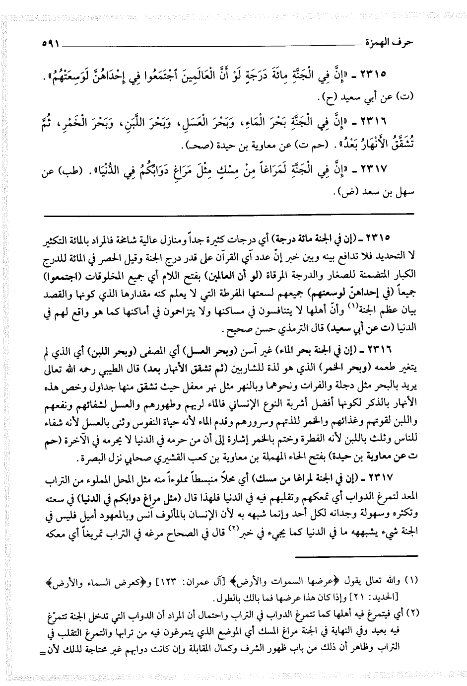 2316 - (إن في الجنة بحر الماء) غير آسن (وبحر العسل) أي المصفى (وبحر اللبن) أي الذي لم يتغير طعمه (وبحر الخمر) الذي هو لذة للشاربين (ثم تشقق الأنهار بعد) قال الطيبي رحمه الله تعالى يريد بالبحر مثل دجلة والفرات ونحوهما وبالنهر مثل نهر معفل حيث تشقق منها جداول وخص هذه الأنهار بالذكر لكونها أفضل أشربة النوع الإنساني فالماء لريهم وطهورهم والعسل لشفائهم ونفعهم واللبن لقوتهم وغذائهم والخمر للذتهم وسرورهم وقدم الماء لأنه حياة النفوس وثنى بالعسل لأنه شفاء للناس وثلث باللبن لأنه الفطرة وختم بالخمر إشارة إلى أن من حرمه في الدنيا لا يحرمه في الآخرة (حم ت عن معاوية بن حيدة) بفتح الحاء المهملة بن معاوية بن كعب القشيري صحابي نزل البصرة.