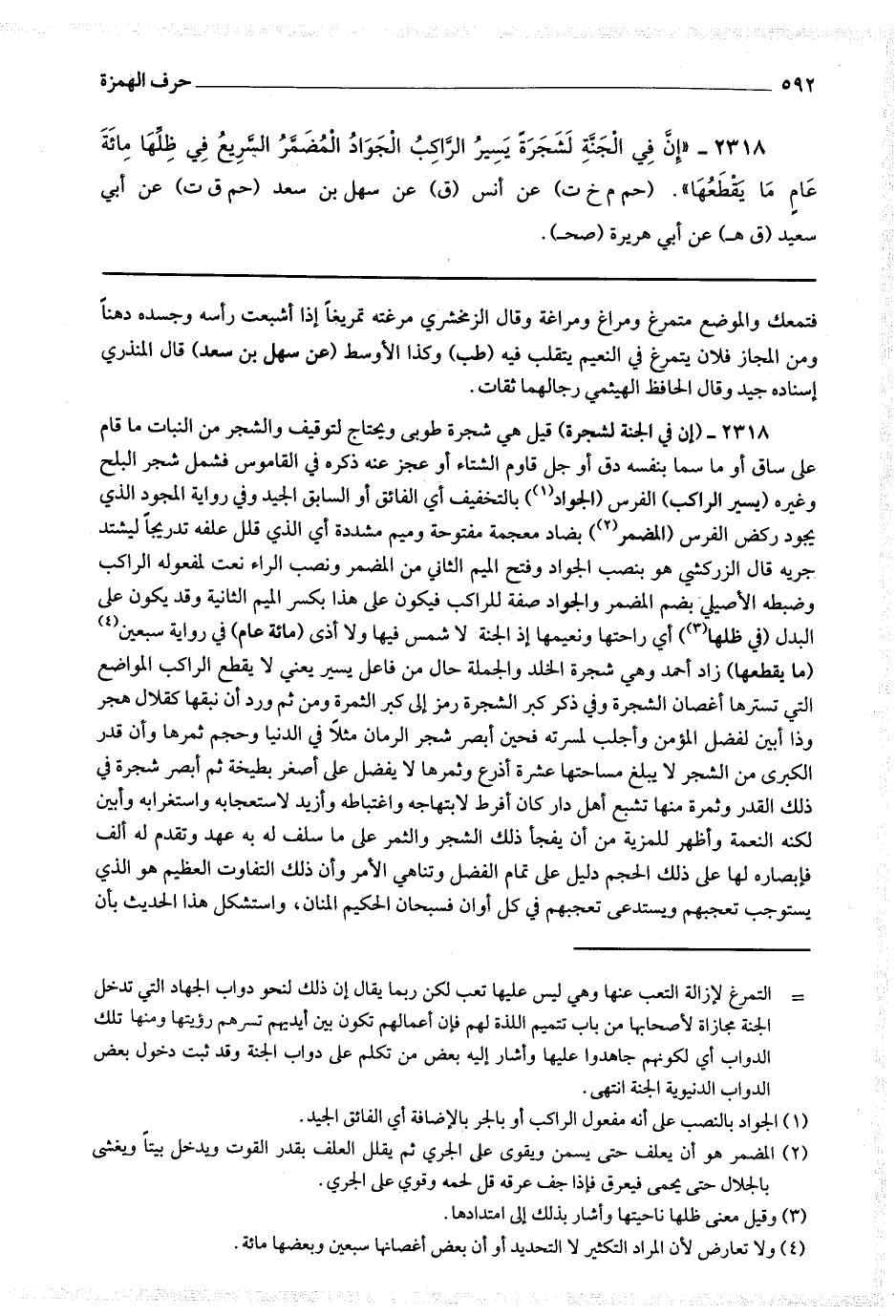 2318 - (إن في الجنة لشجرة) قيل هي شجرة طوبى ويحتاج لتوقيف والشجر من النبات ما قام على ساق أو ما سما بنفسه دق أو جل قاوم الشتاء أو عجز عنه ذكره في القاموس فشمل شجر البلح وغيره (يسير الراكب) الفرس (الجواد (1) بالتخفيف أي الفائق أو السابق الجيد وفي رواية المجود الذي يجود ركض الفرس (المضمر (2) بضاد معجمة مفتوحة وميم مشددة أي الذي قلل علفه تدريجا ليشتد جريه قال الزركشي هو بنصب الجواد وفتح الميم الثانية من المضمر ونصب الراء نعت لمفعول الراكب وضبطه الأصيلي بضم المضمر والجواد صفة للراكب فيكون على هذا بكسر الميم الثانية وقد يكون على البدل (في ظلها (3) أي راحتها ونعيمها إذ الجنة لا شمس فيها ولا أذى (مائة عام) في رواية سبعين (4) (ما يقطعها) زاد أحمد وهي شجرة الخلد والجملة حال من فاعل يسير يعني لا يقطع الراكب المواضع التي تسترها أغصان الشجرة وفي ذكر كبر الشجرة رمز إلى كبر الثمرة ومن ثم ورد أن نبقها كقلال هجر وذا أبين لفضل المؤمن وأجلب لمسرته فحين أبصر شجر الرمان مثلا في الدنيا وحجم ثمرها وأن قدر الكبرى من الشجر لا يبلغ مساحتها عشرة أذرع وثمرها لا يفضل على أصغر بطيخة ثم أبصر شجرة في ذلك القدر وثمرة منها تشيع أهل دار كان أفرط لابتهاجه واغتباطه وأزيد لاستعجابه واستغرابه وأبين لكنه النعمة وأظهر للمزية من أن يفجأ ذلك الشجر والثمر على ما سلف له به عهد وتقدم له ألف فإبصاره لها على ذلك الحجم دليل على تمام الفضل وتناهي الأمر وأن ذلك التفاوت العظيم هو الذي يستوجب تعجبهم ويستدعي تحجبهم في كل أوان فسبحان الحكيم المنان ، واستشكل هذا الحديث بأن