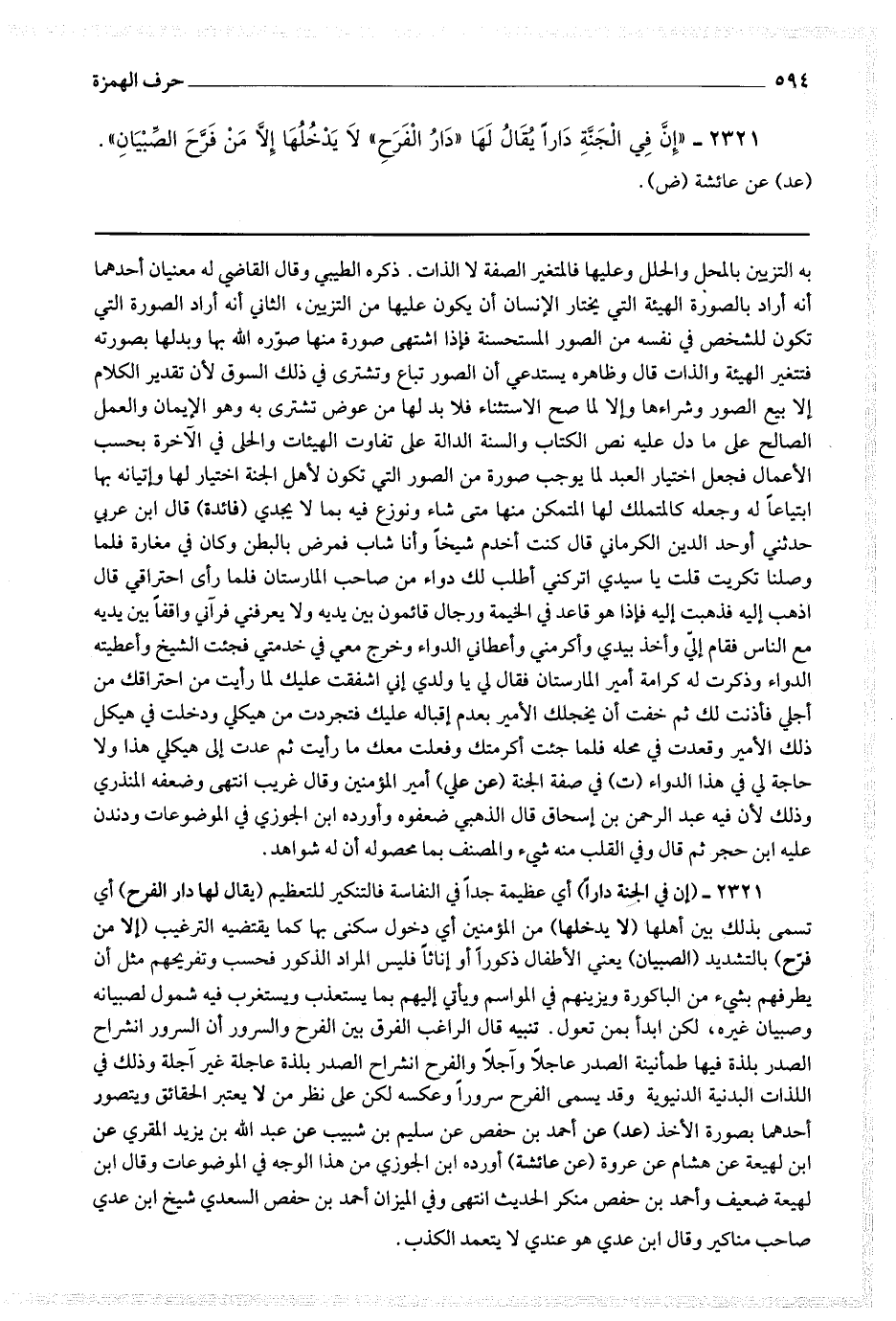 2321 - (إن في الجنة دارا) أي عظيمة جدا في النفاسة فالتنكير للتعظيم (يقال لها دار الفرح) أي تسمى بذلك بين أهلها (لا يدخلها) من المؤمنين أي دخول سكنى بها كما يقتضيه الترغيب (إلا من فرح) بالتشديد (الصبيان) يعني الأطفال ذكورا أو إناثا فليس المراد الذكور فحسب وتفريحهم مثل أن يطرفهم بشئ من الباكورة ويزينهم في المواسم ويأتي إليهم بما يستعذب ويستغرب فيه شمول لصبيانه وصبيان غيره لكن أبدأ بمن تعول.