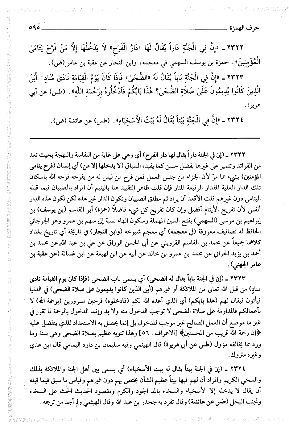 2322 - (إن في الجنة دارا يقال لها الفرح) أي وهي على غاية من النفاسة والبهجة بحيث تعد من الفرائد وتتميز على غيرها بفضل حسن كما يفيده السياق (لا يدخلها إلا من) أي إنسان (فرح يتامى المؤمنين) بشئ مما مر لأن الجزاء من جنس العمل فمن فرح من ليس له من يفرحه فرحه الله بإسكان تلك الدار العلية المقدار الرفيعة المنار فإن قلت ظاهر التقييد هنا اليتيم أن المراد بالصبيان فيما قبله