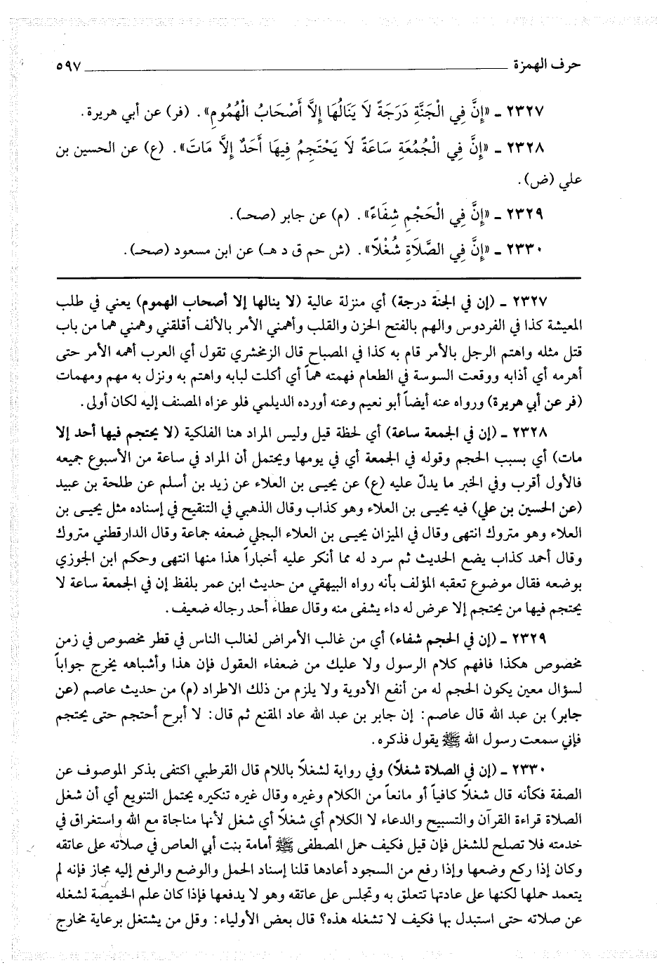2328 - (إن في الجمعة ساعة) أي لحظة قيل وليس المراد هنا الفلكية (لا يحتجم فيها أحد إلا مات) أي بسبب الحجم وقوله في الجمعة أي في يومها ويحتمل أن المراد في ساعة من الأسبوع جميعه فالأول أقرب وفي الخبر ما يدل عليه (ع) عن يحيى بن العلاء عن زيد بن أسلم عن طلحة بن عبيد (عن الحسين بن علي) فيه يحيى بن العلاء وهو كذاب وقال الذهبي في التنقيح في إسناده مثل يحيى بن العلاء وهو متروك انتهى وقال في الميزان يحيى بن العلاء البجلي ضعفه جماعة وقال الدارقطني متروك وقال أحمد كذاب يضع الحديث ثم سرد له مما أنكر عليه أخبارا هذا منها انتهى وحكم ابن الجوزي بوضعه فقال موضوع تعقبه المؤلف بأنه رواه البيهقي من حديث ابن عمر بلفظ إن في الجمعة ساعة لا يحتجم فيها من يحتجم إلا عرض له داء يشفى منه وقال عطاء أحد رجاله ضعيف.