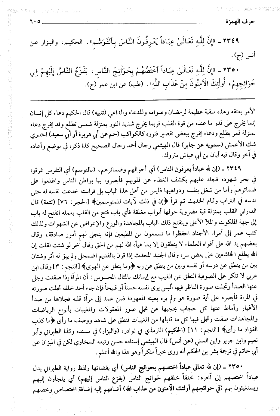 2349 - (إن لله عبادا يعرفون الناس) أي أحوالهم وضمائرهم (بالتوسم) أي التفرس غرقوا في بحر شهوده فجاد عليهم بكشف الغطاء عن قلوبهم فأبصروا بها بواطن الناس واطلعوا على ضمائرهم وأما من شغل بنفسه ودواهيها فليس من أهل هذا الباب بل فراسته خدعت نفسه له حتى
