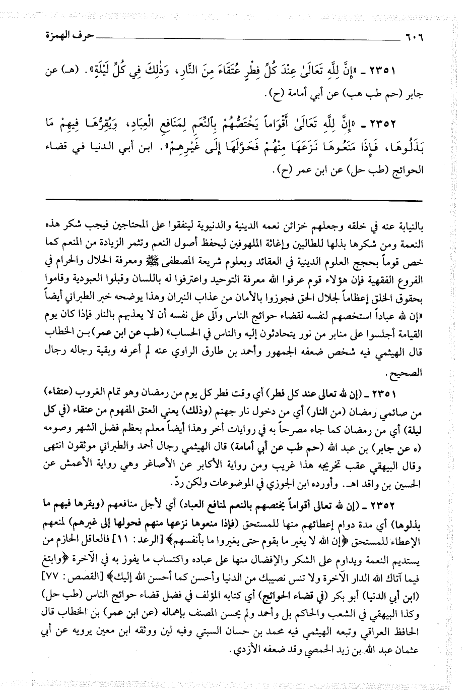 2352 - (إن لله تعالى أقواما يختصهم بالنعم لمنافع العباد) أي لأجل منافعهم (ويقرها فيهم ما بذلوها) أي مدة دوام إعطائهم منها للمستحق (فإذا منعوها نزعها منهم فحولها إلى غيرهم) لمنعهم الإعطاء للمستحق * (إن الله لا يغير ما بقوم حتى يغيروا ما بأنفسهم) * [ الرعد : 11 ] فالعاقل الحازم من يستديم النعمة ويداوم على الشكر والإفضال منها على عباده واكتساب ما يفوز به في الآخرة * (وابتغ فيما آتاك الله الدار الآخرة ولا تنس نصيبك من الدنيا وأحسن كما أحسن الله إليك) * [ القصص : 77 ] (ابن أبي الدنيا) أبو بكر (في قضاء الحوائج) أي كتابه المؤلف في فضل قضاء حوائج الناس (طب حل) وكذا البيهقي في الشعب والحاكم بل وأحمد ولم يحسن المصنف بإهماله (عن ابن عمر) بن الخطاب قال الحافظ العراقي وتبعه الهيثمي فيه محمد بن حسان السمبتي وفيه لين ووثقه ابن معين يرويه عن أبي عثمان عبد الله بن زيد الحمصي وقد ضعفه الأزدي.
