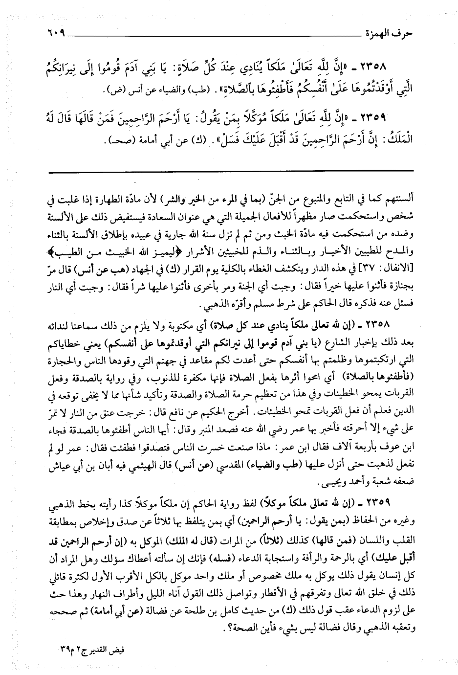 2358 - إن لله تعالى ملكا ينادي عند كل صلاة) أي مكتوبة ولا يلزم من ذلك سماعنا لندائه بعد ذلك بإخبار الشارع (يا بني آدم قوموا إلى نيرانكم التي أوقدتموها على أنفسكم) يعني خطاياكم التي ارتكبتموها وظلمتم بها أنفسكم حتى أعدت لكم مقاعد في جهنم التي وقودها الناس والحجارة (فأطفئوها بالصلاة) أي امحوا أثرها بفعل الصلاة فإنها مكفرة للذنوب وفي رواية بالصدقة وفعل القربات يمحو الخطيئات وفي هذا من تعظيم حرمة الصلاة والصدقة وتأكيد شأنها مما لا يخفى توقعه في الدين فعلم أن فعل القربات تمحو الخطيئات.