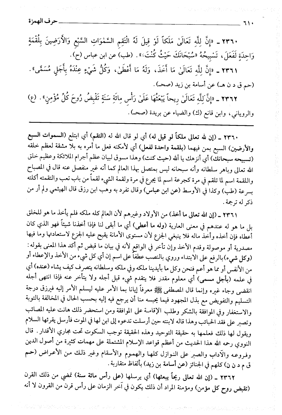 قال النووي رحمه الله هذا الحديث من أعظم قواعد الإسلام المشتملة على مهمات كثيرة من أصول الدين وفروعه والآداب والصبر على النوازل كلها والهموم والأسقام وغير ذلك من الأعراض (حم ق م د ن ه) كلهم في الجنائز (عن أسامة بن زيد) بألفاظ متقاربة.